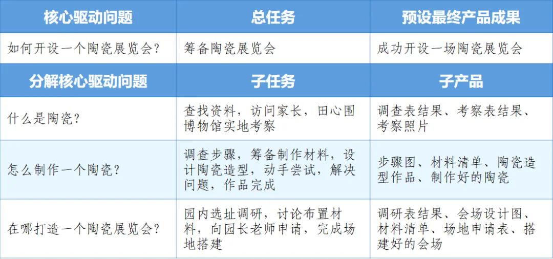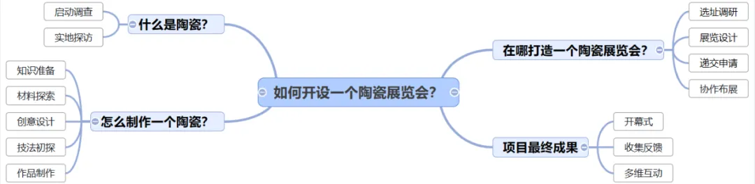 根据核心问题“如何办一场陶瓷展”?师幼共同讨论后将其分解为“什么是陶瓷”“怎么制作”“在哪办”三个子任务,形成清晰的项目推进路线。