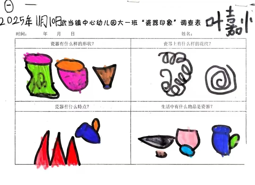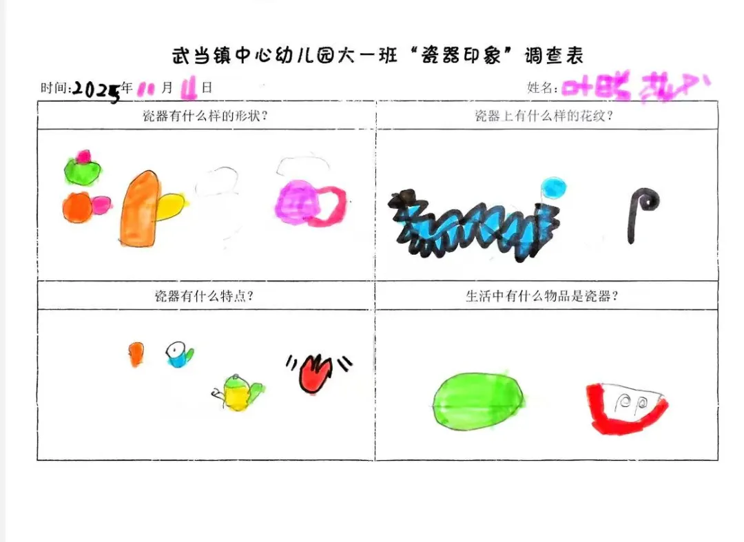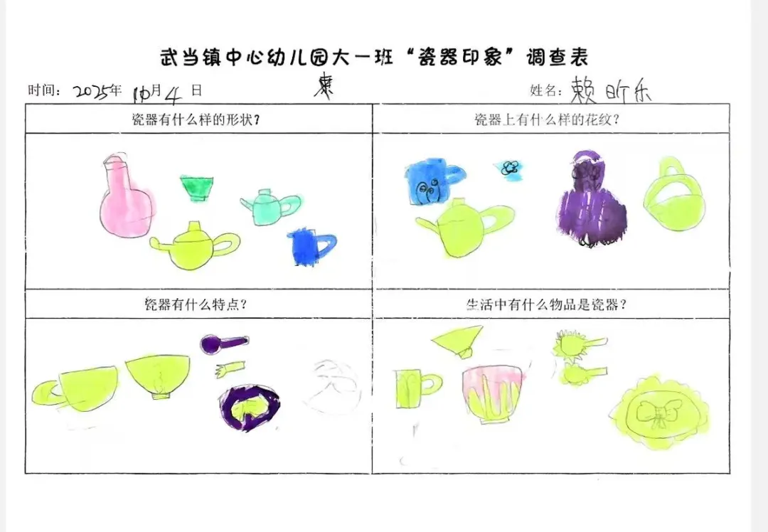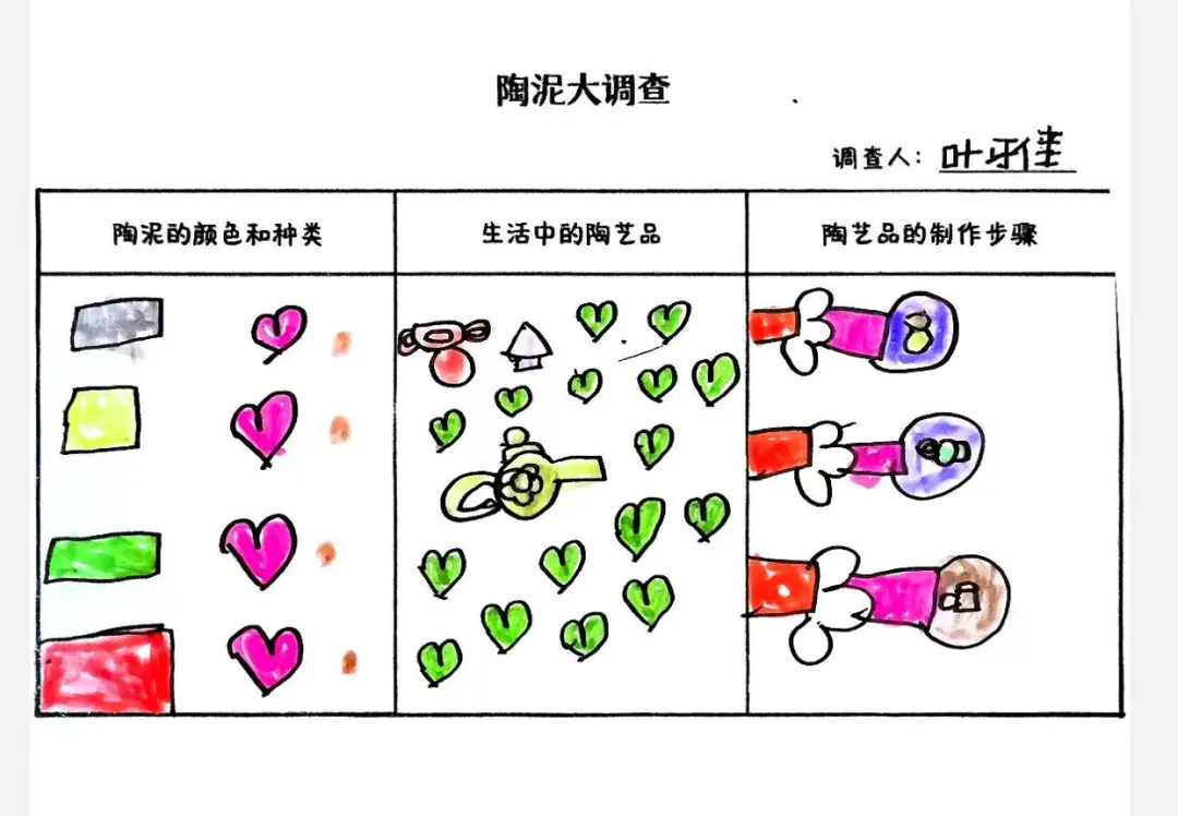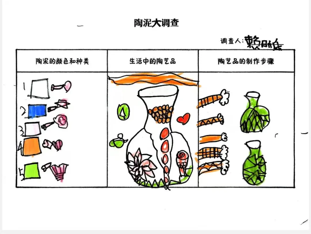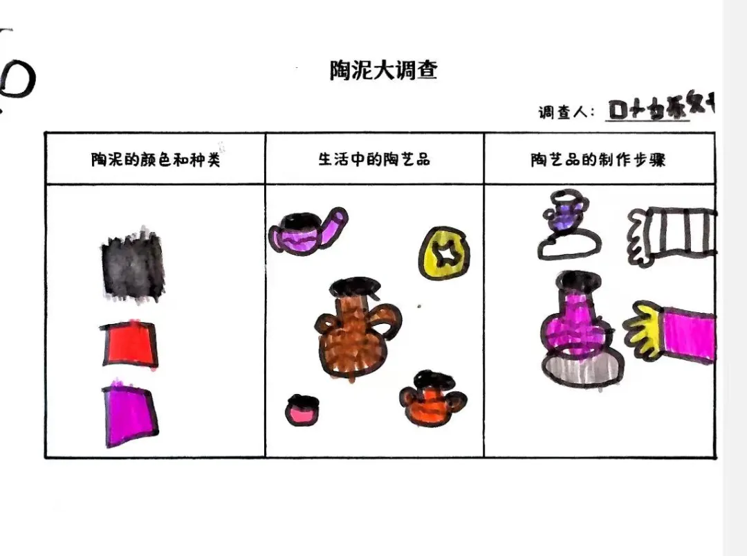 幼儿从观看视频的兴趣点出发,通过家庭调查与实地探访田心围,系统收集和整理了关于陶瓷特质、形状、纹样与生活用途的初步认知。他们从被动观察者转变为主动探究者,不仅建立了对陶瓷的概念性理解,更与本土文化产生了深刻的情感联结,从而自然生发了“想自己动手做”的强烈愿望,为项目注入了持续的内驱力。