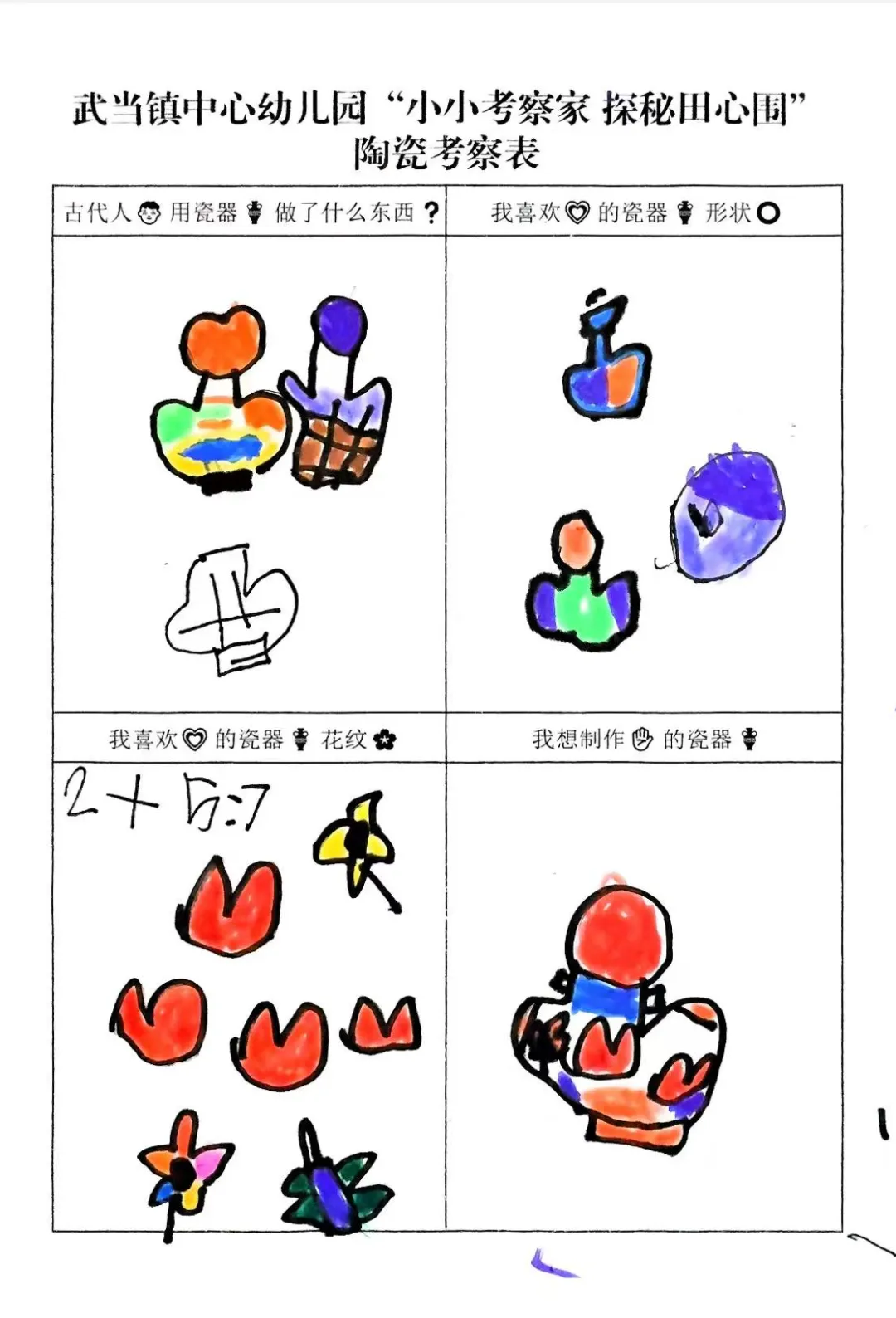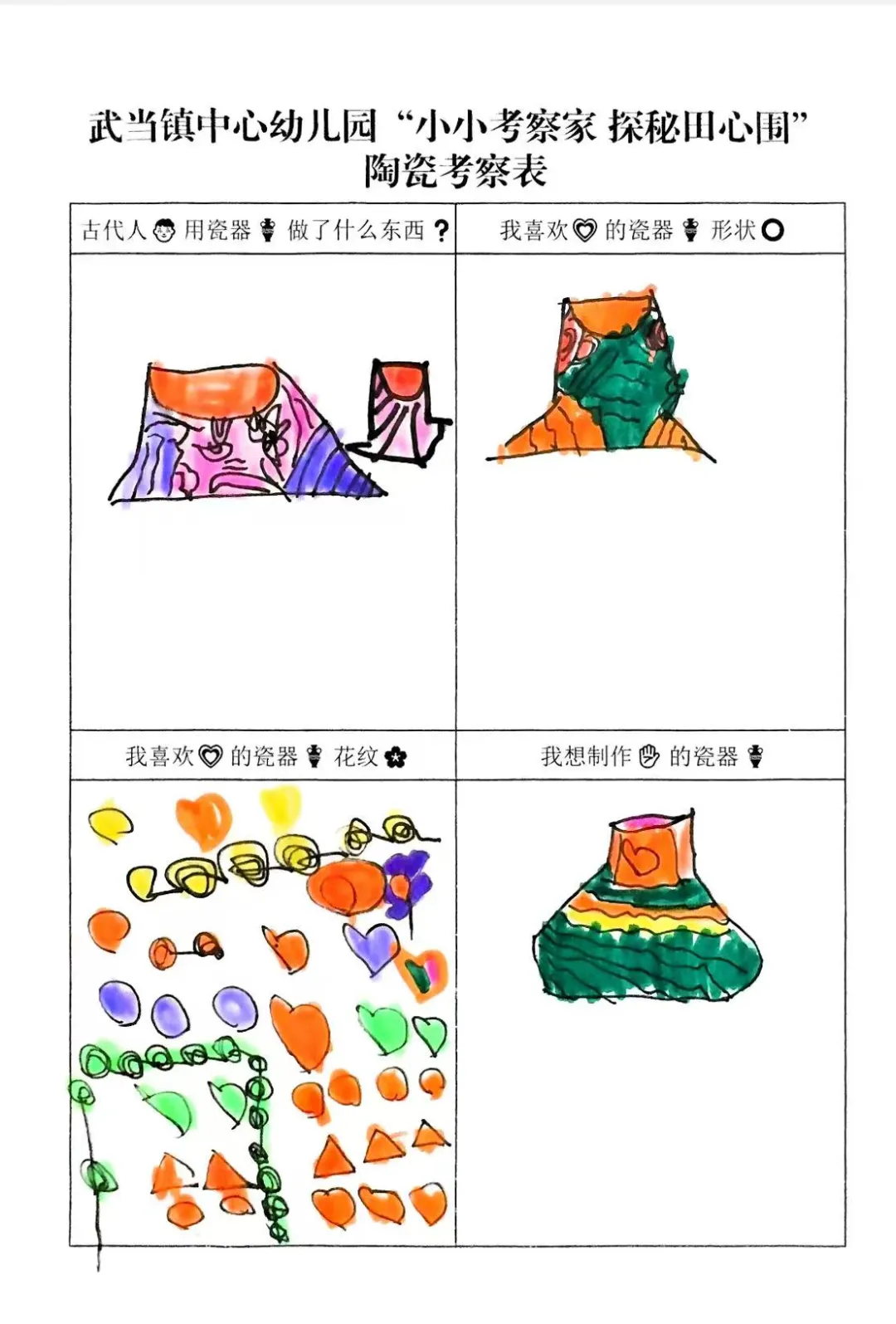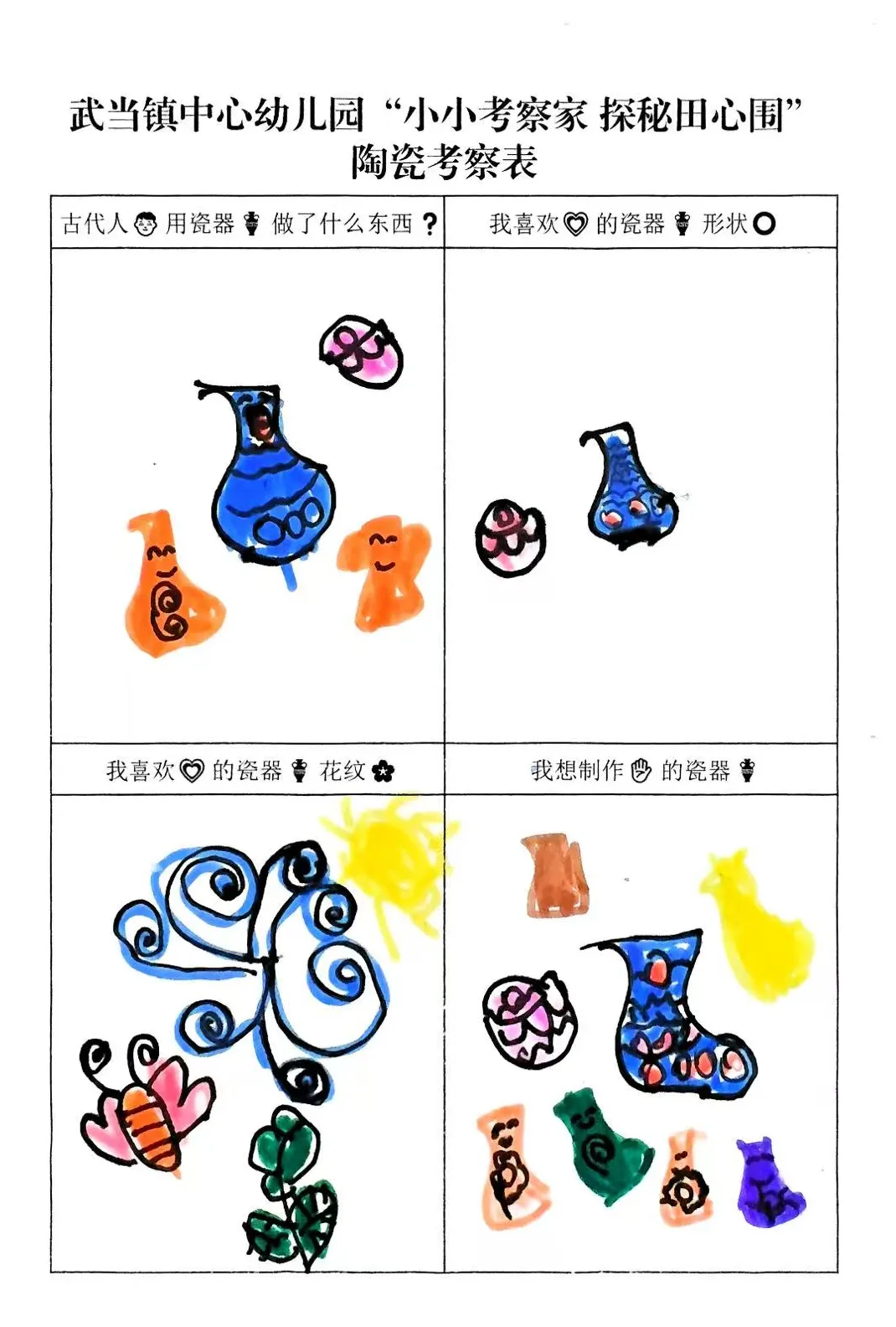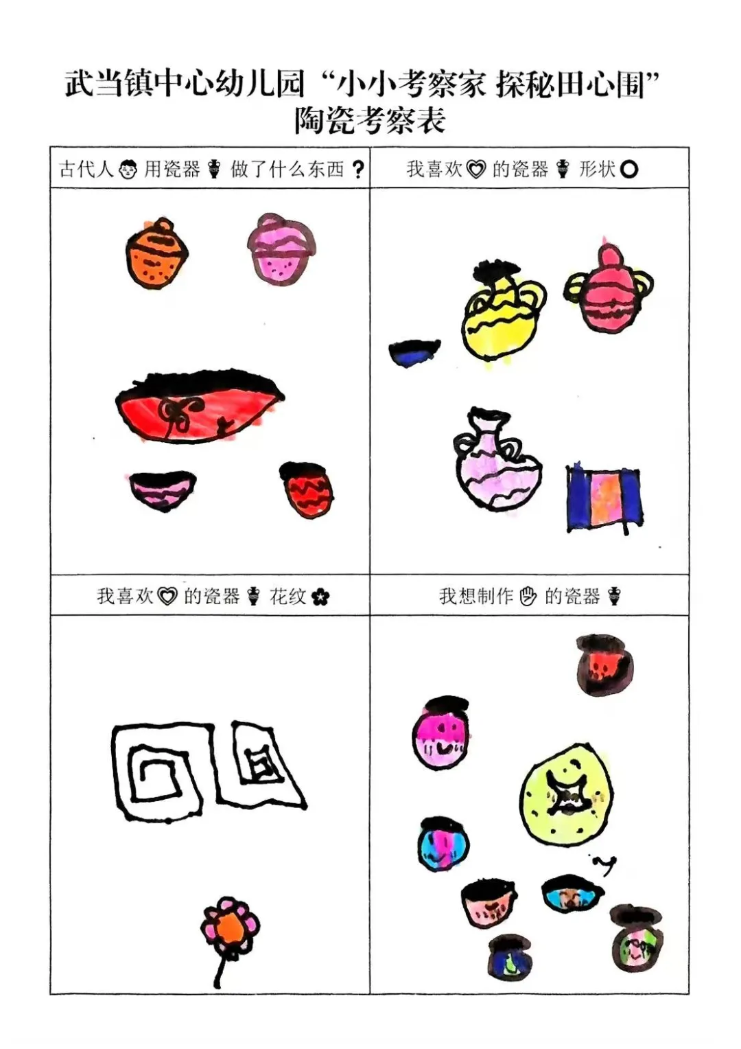 幼儿从观看视频的兴趣点出发,通过家庭调查与实地探访田心围,系统收集和整理了关于陶瓷特质、形状、纹样与生活用途的初步认知。他们从被动观察者转变为主动探究者,不仅建立了对陶瓷的概念性理解,更与本土文化产生了深刻的情感联结,从而自然生发了“想自己动手做”的强烈愿望,为项目注入了持续的内驱力。