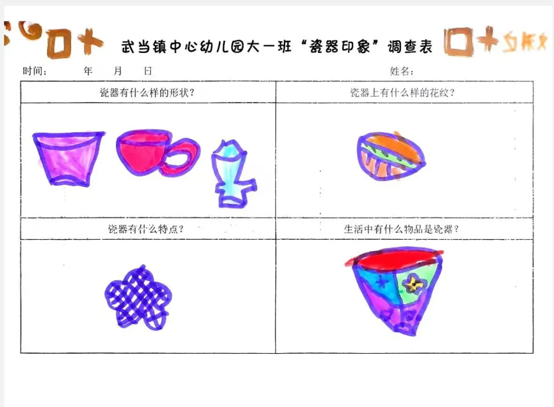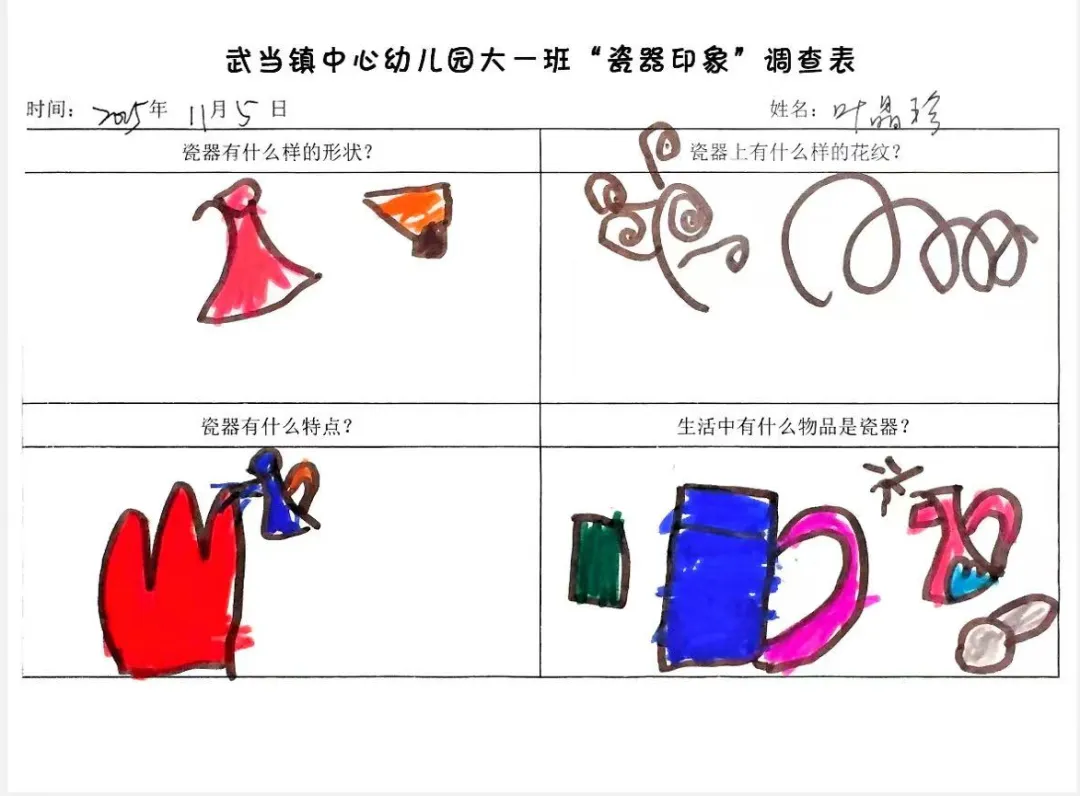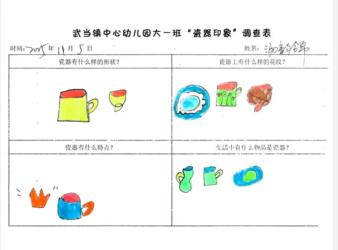 幼儿携带《“陶瓷印象”调查表》回家,与家人共同通过书籍、网络、询问长辈等方式寻找答案,并采用绘画、拍照、家长辅助文字的方式记录。