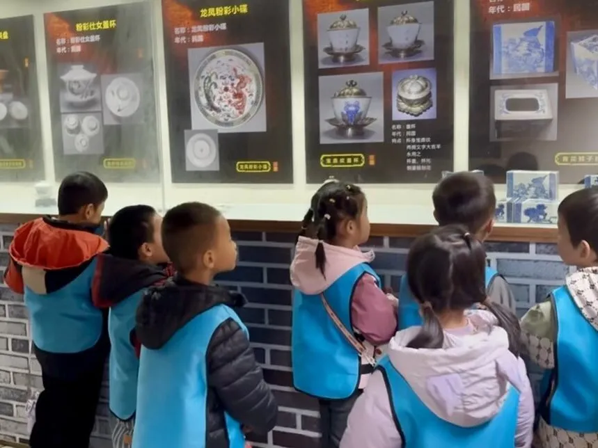 在“探秘田心围”主题活动中,教师带孩子们观看了本地特色围屋的纪录片。当看到田心围博物馆内陈列的青花瓷碗、彩釉陶罐等藏品时,孩子们惊叹连连。