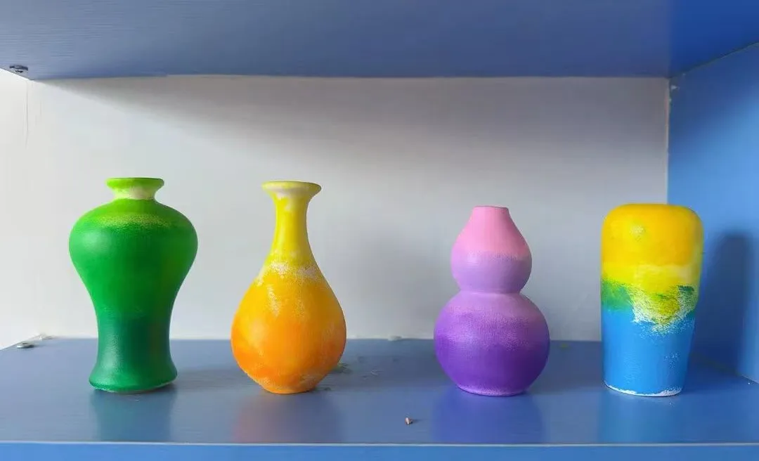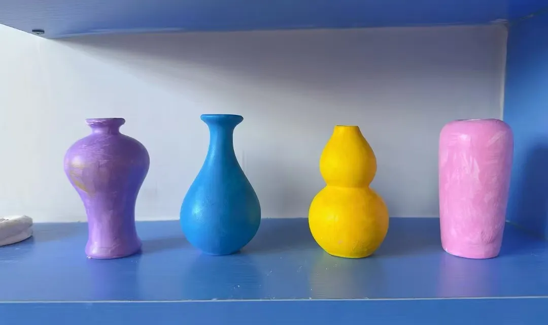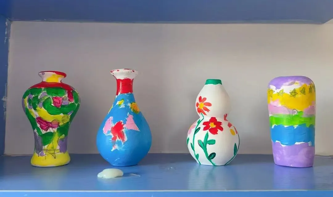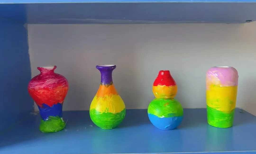作品完成后,幼儿学习使用安全的丙烯颜料对花瓶进行装饰,并在干燥后涂上亮油。在班级内举办“作品预展会”,幼儿相互介绍作品创意与制作故事,为最终展览的讲解做准备。