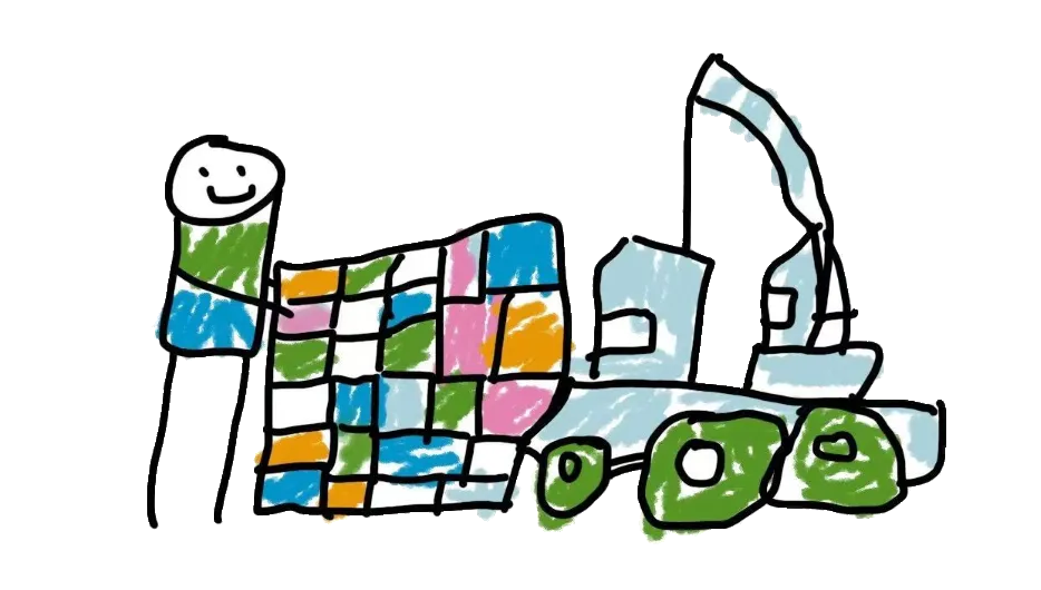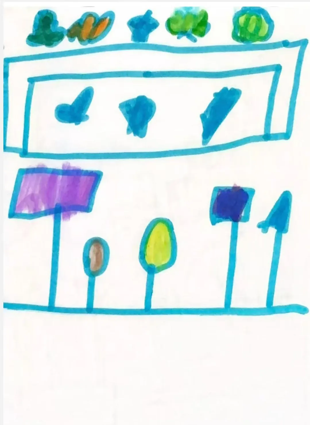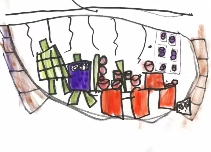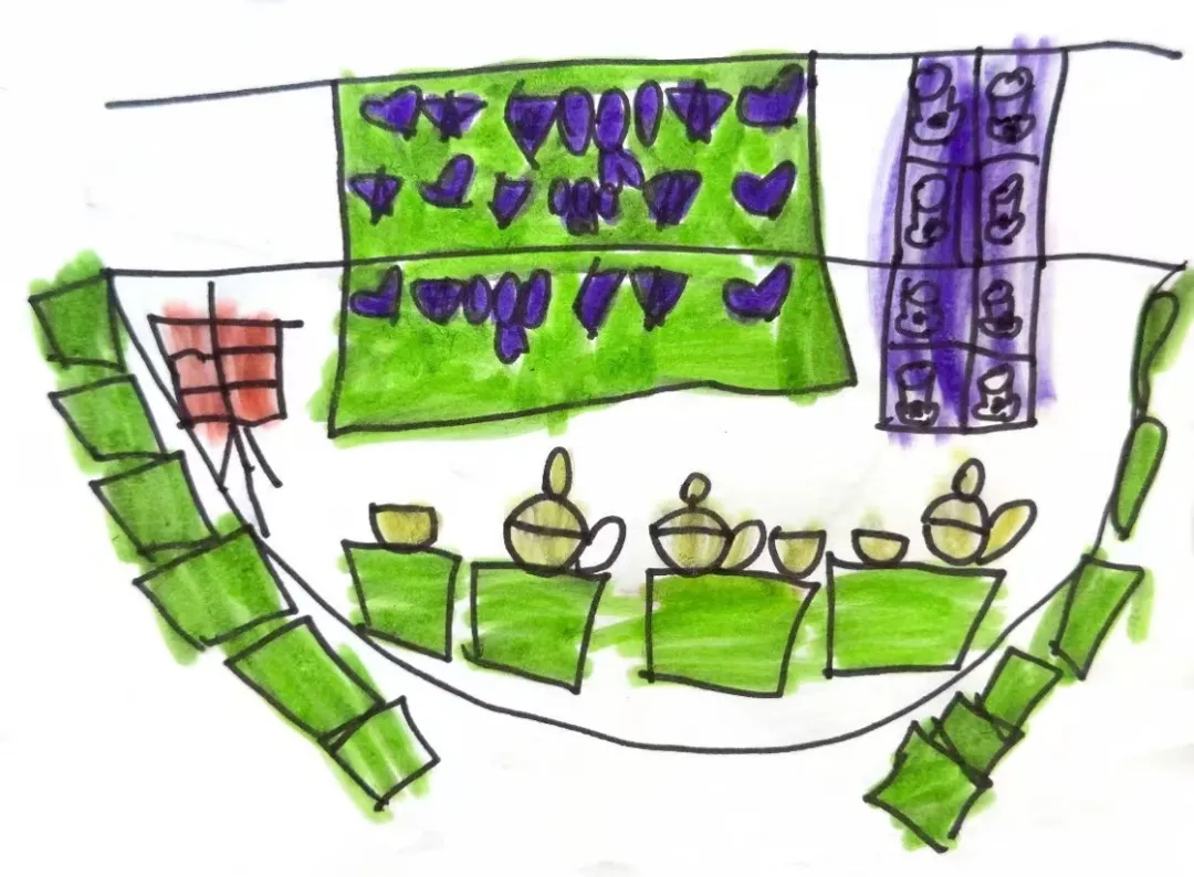 幼儿讨论展览需要的区域,如“海报展板区”、“我们的作品 展区”、“投票区”。小组合作在纸张上绘制展览平面布局图,根据设计图,列出所需物资。