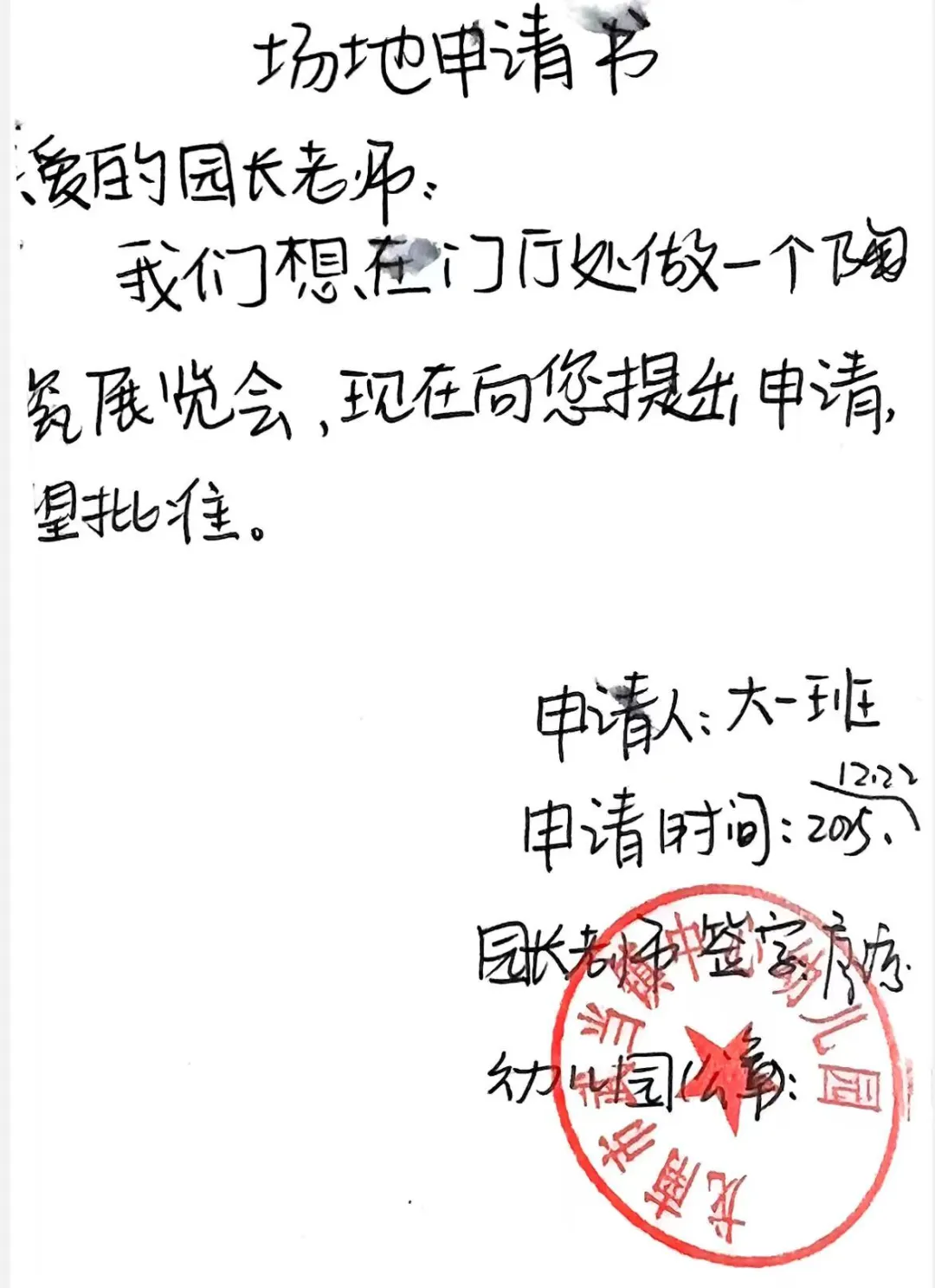《大一班陶瓷展览会场地申请书》