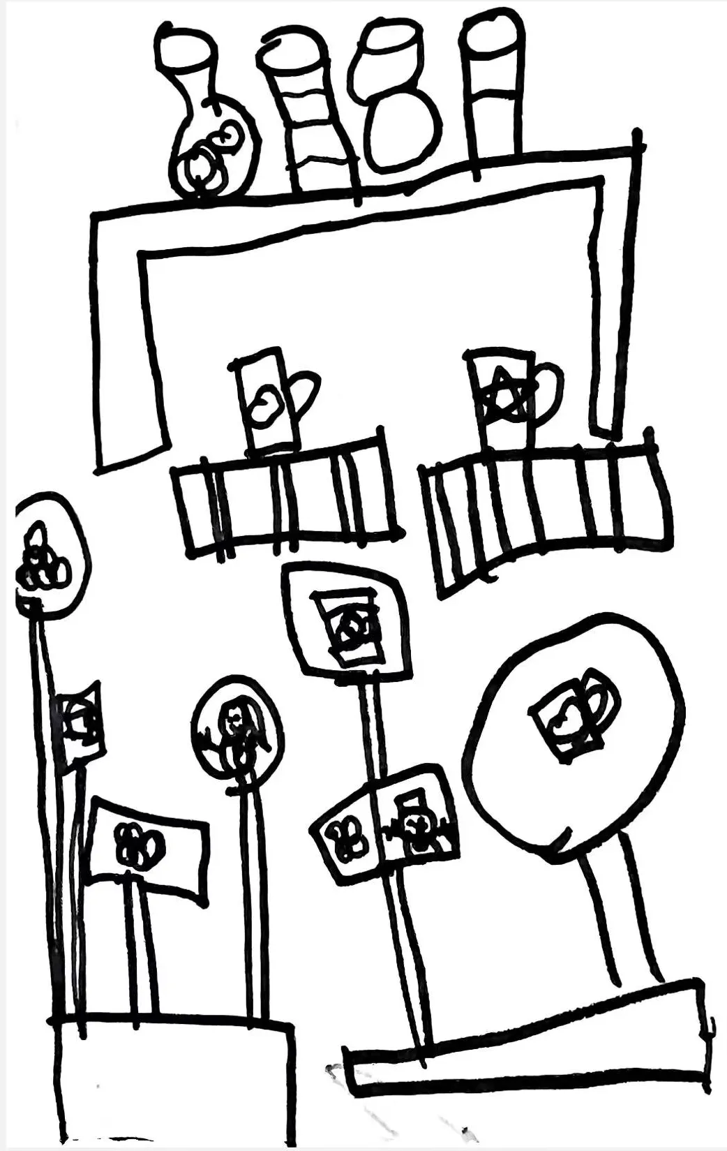 幼儿为自己的作品进行设计构思,“我想做一个给小鸟喝水的碗”、“我想做一个有怪兽脸的花瓶”。教师把活动融入一日活动当中,引导幼儿绘制设计草图(集体活动),使用纸杯、纸筒、纸碗等设计纹样(区域游戏),使用黏土进行模拟制作陶瓷(户外游戏《趣搭田心围》)。