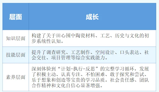 项目结束后,教师进行了复盘。例如,未来可以更深入地挖掘陶瓷中的科学元素,比如釉色变化、对称图案、器物容量;可以尝试引入更专业的烧制环节;可以探索如何将项目成果转化为服务社区的活动。
