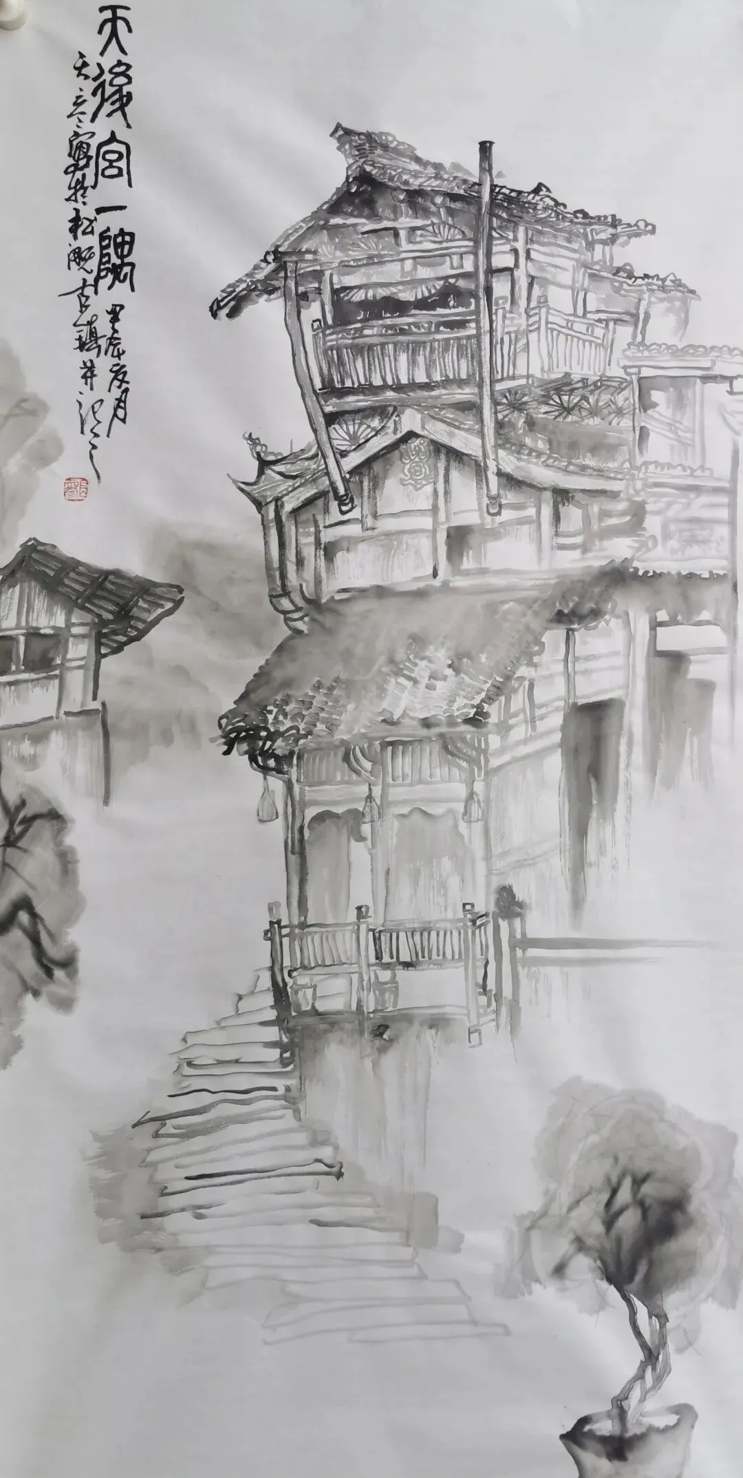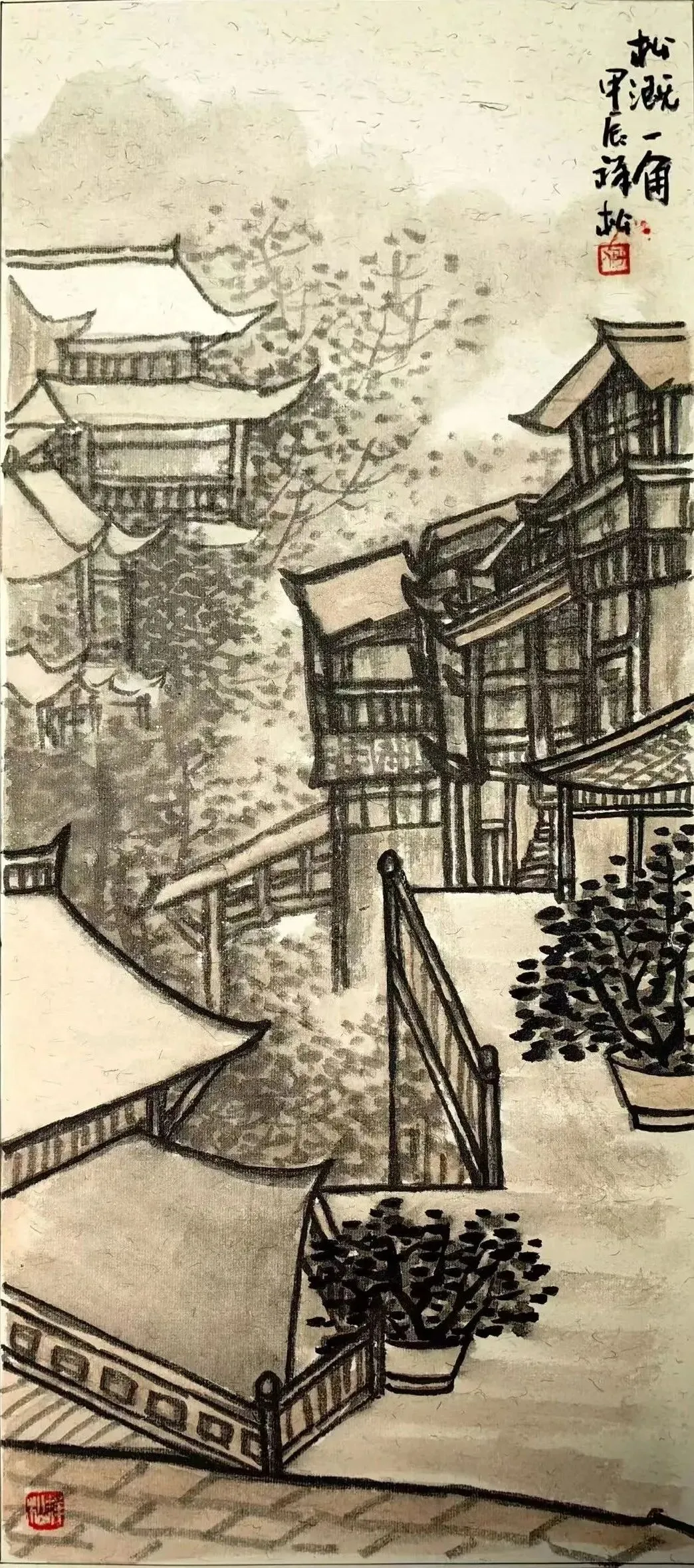 张天彦 《天后宫一隅 》 中国画 138cmx68cm