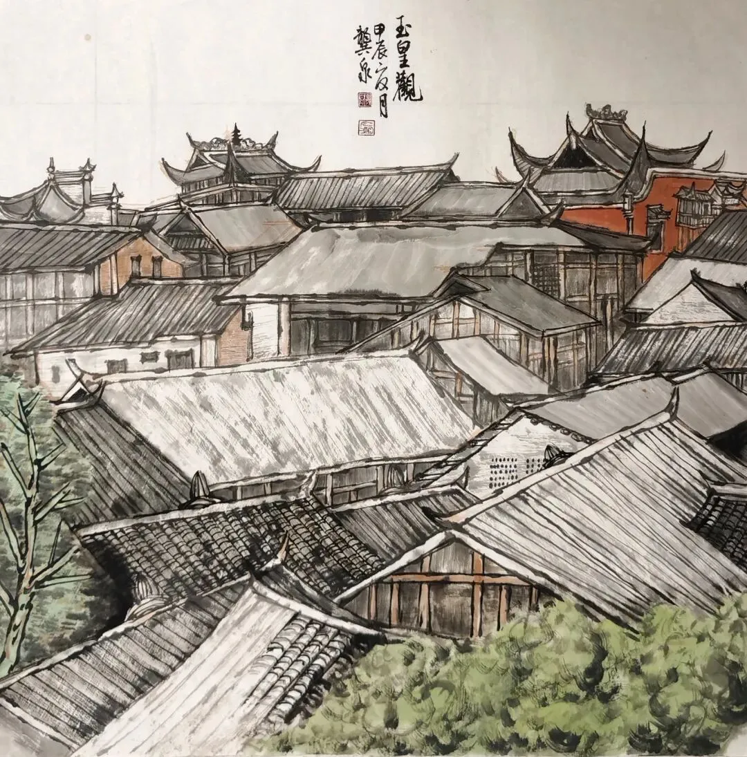 龚泉《玉皇观》中国画 68x68cm