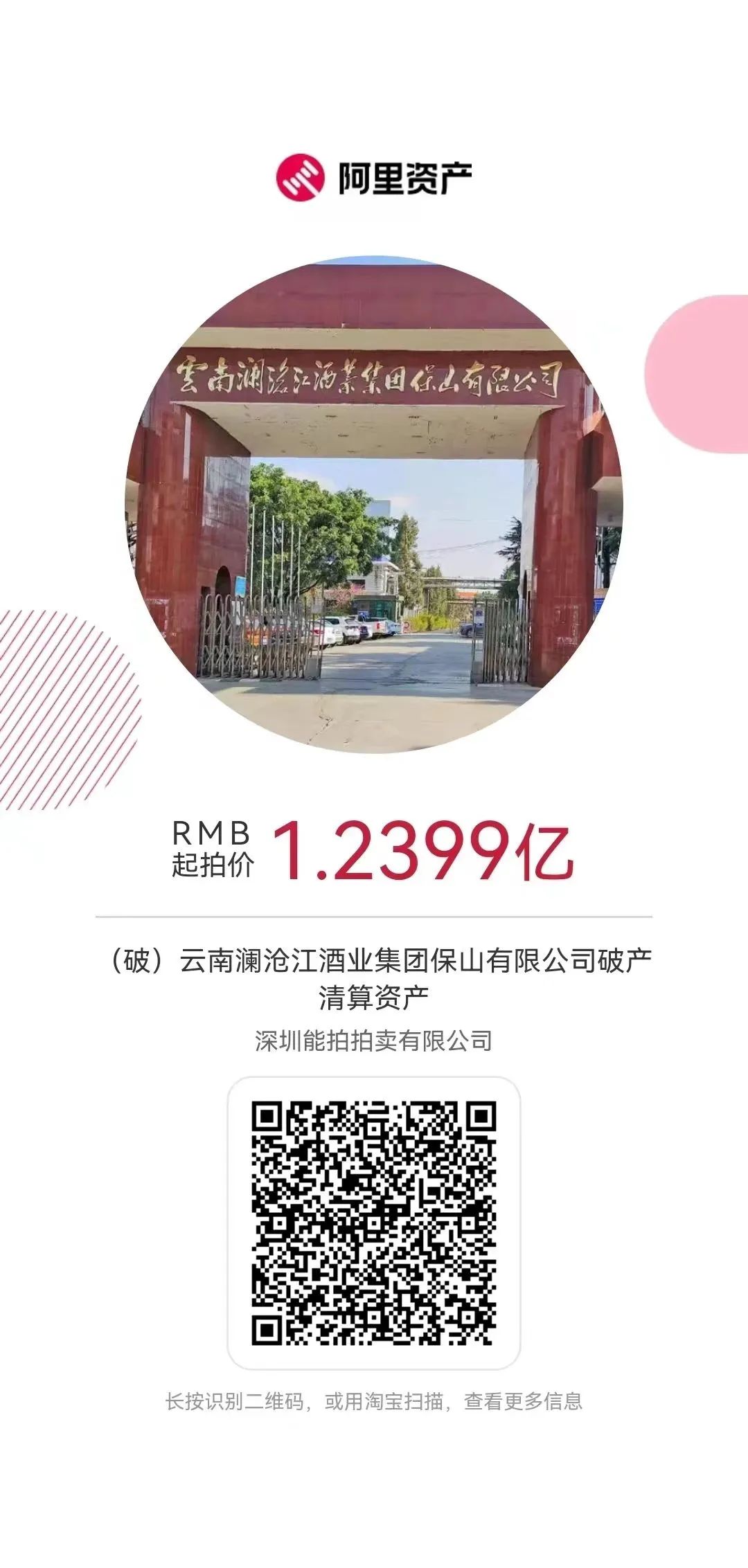 依据云南保山市隆阳区人民法院(2021)云0502破申4号《民事裁定书》及(2021)云0502破申4号之五《民事裁定书》,受云南澜沧江酒业集团保山有限公司破产管理人委托,我公司将于2023年5月8日10时起至2023年5月9日10时止(延时除外)在阿里淘宝网资产竞价网络平台上公开拍卖云南澜沧江酒业集团保山有限公司破产清算资产,现将拍卖事宜公告如下:
