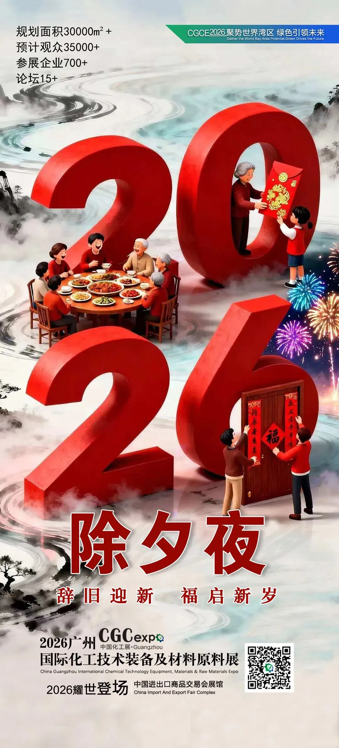 红灯高挂映团圆,烟火璀璨贺新元!当除夕的钟声即将敲响,当万家灯火点亮人间温情,我们作别转型攻坚的峥嵘岁,昂首阔步迈入2026丙午马年。值此辞旧迎新、阖家团圆的美好时刻,2026中国广州国际化工展组委会全体员工,向行业同仁、参展商、合作伙伴及各界朋友,致以最诚挚的除夕问候和最热烈的新春祝福!