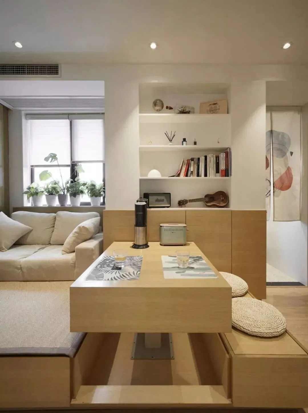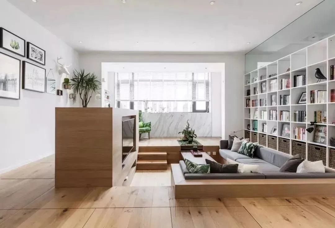 设计师很巧妙的采用了下沉式设计+储物地台组合,保证审美的同时也解决了小户型的收纳难题。