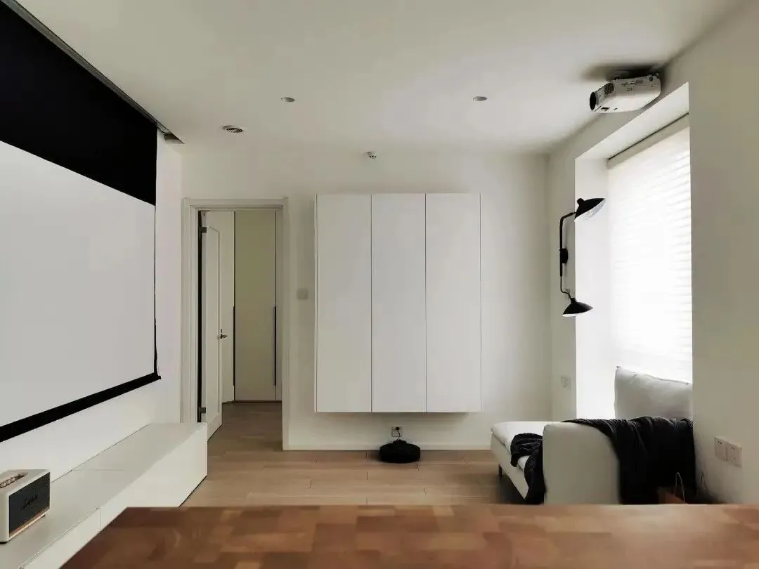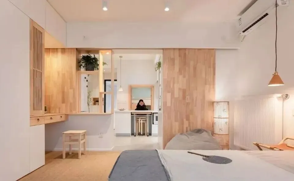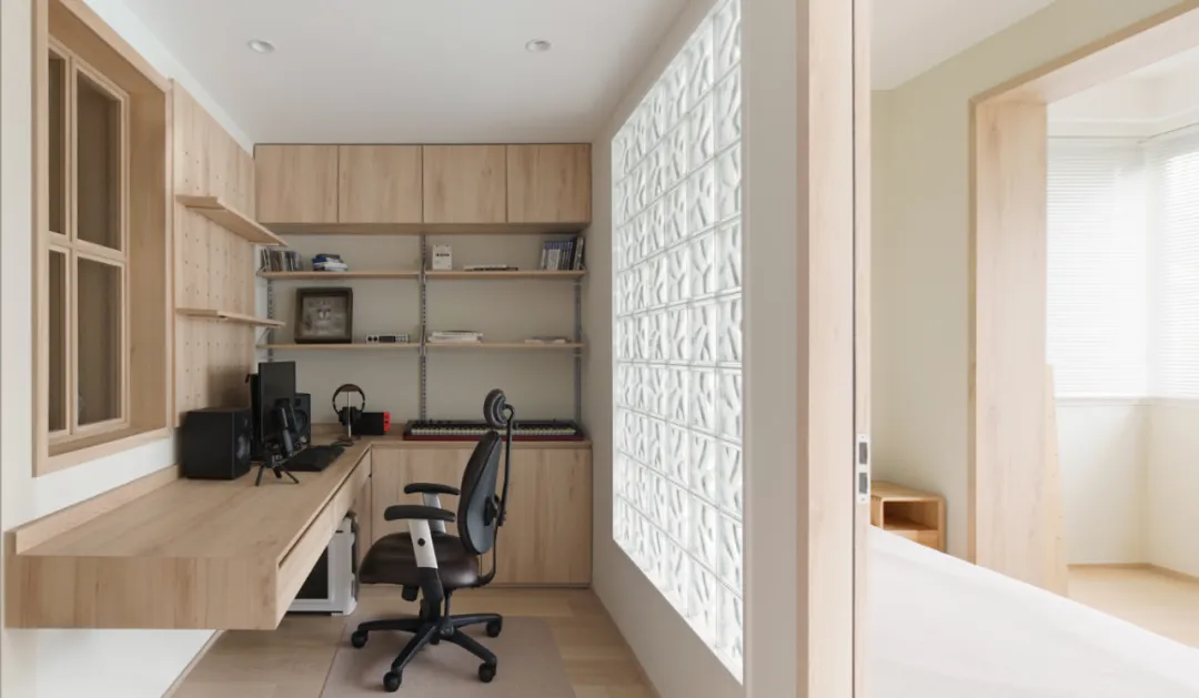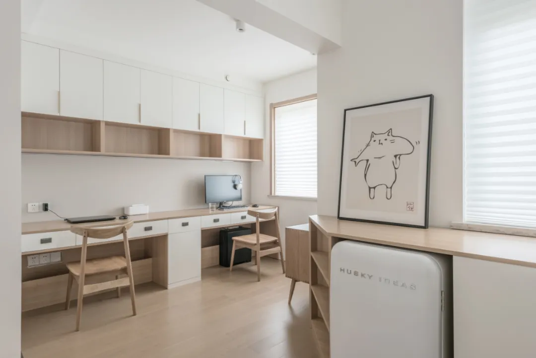 平平无奇的精装房变身清爽日式风,将两间卧室合并出来的多功能房间集储物、居家办公、次卧一体。