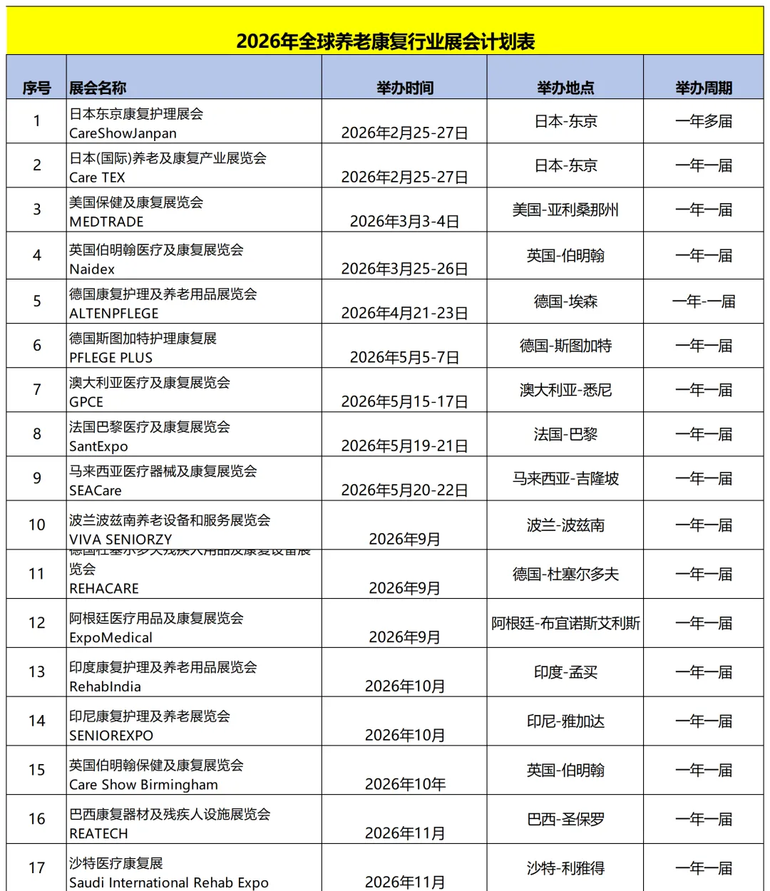 2026年全球养老康复展会计划表
