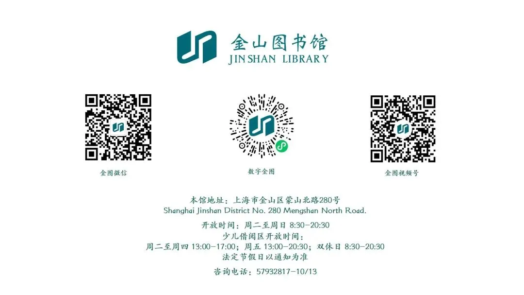 特别声明:本公众号仅用于上海市金山区图书馆公共文化服务及阅读推广,不用于任何商业用途。图片、文字、音频等版权均属原作者。如有侵权,请及时与本公众号联系。