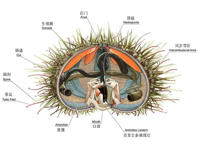 上面我们介绍了海胆的外在——棘刺和壳体,下面我们来看看海胆的内部结构。