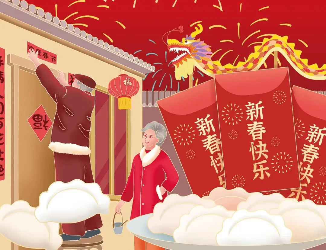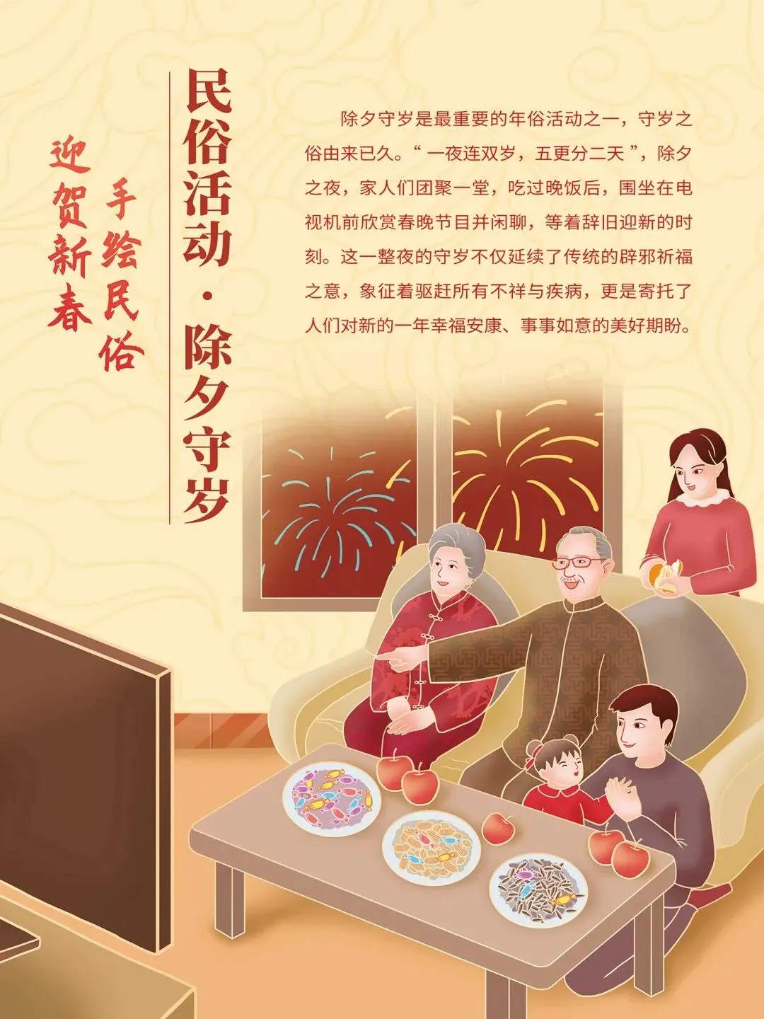 展览以原创手绘的形式,展现贴春联、放鞭炮、包饺子、拜年等经典民俗活动,每幅作品均配有详实的文字解读,深入阐述春节的起源、寓意及各地多样化的庆祝习俗。同时,展览还精选与春节相关的古典诗词与民间故事,多维度解析这一节日的文化精神,引导观众感受其中蕴含的情感寄托与文化活力。