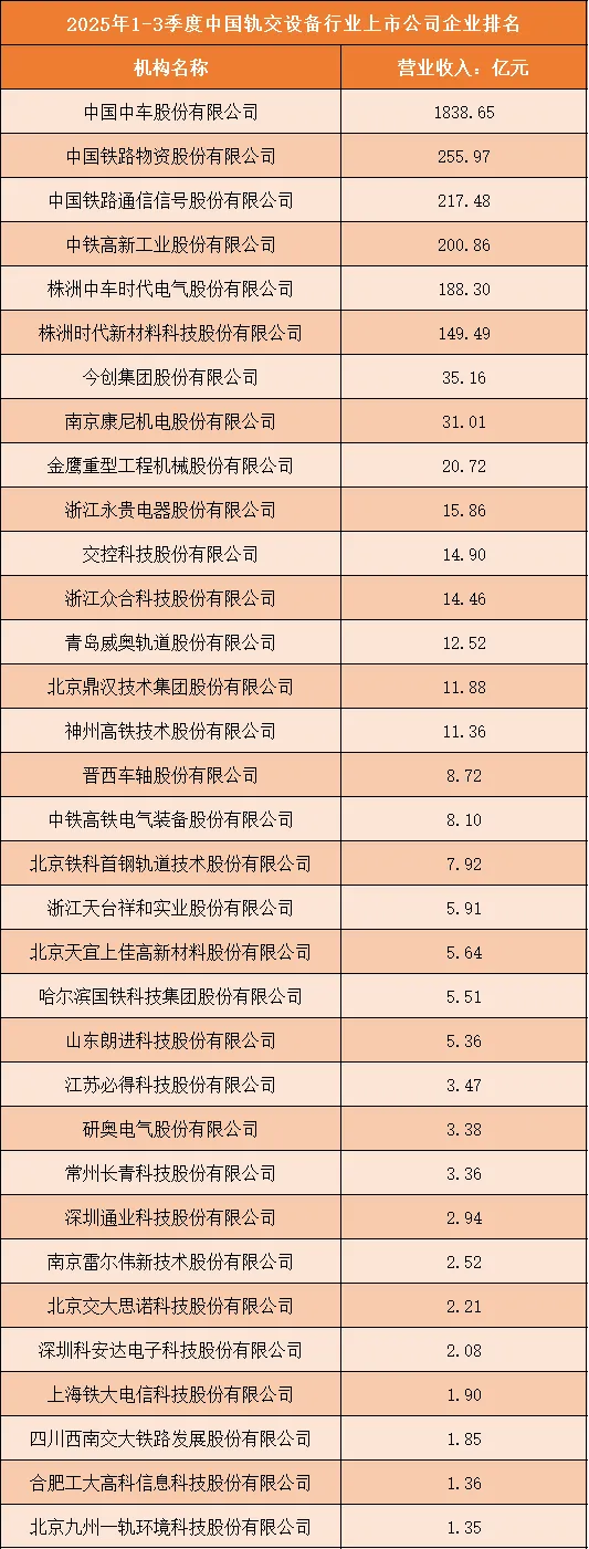 一、2025 年 1-3 季度中国轨交设备行业上市公司企业排名分析