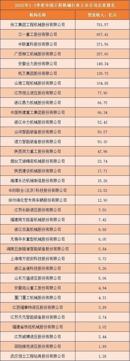 根据申万行业分类,2025年1-3季度中国工程机械行业上市公司按营业收入排名如下:(A股上市公司)