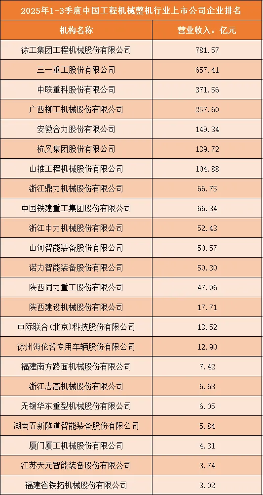 一、2025年1-3季度中国工程机械整机行业上市公司企业排名分析