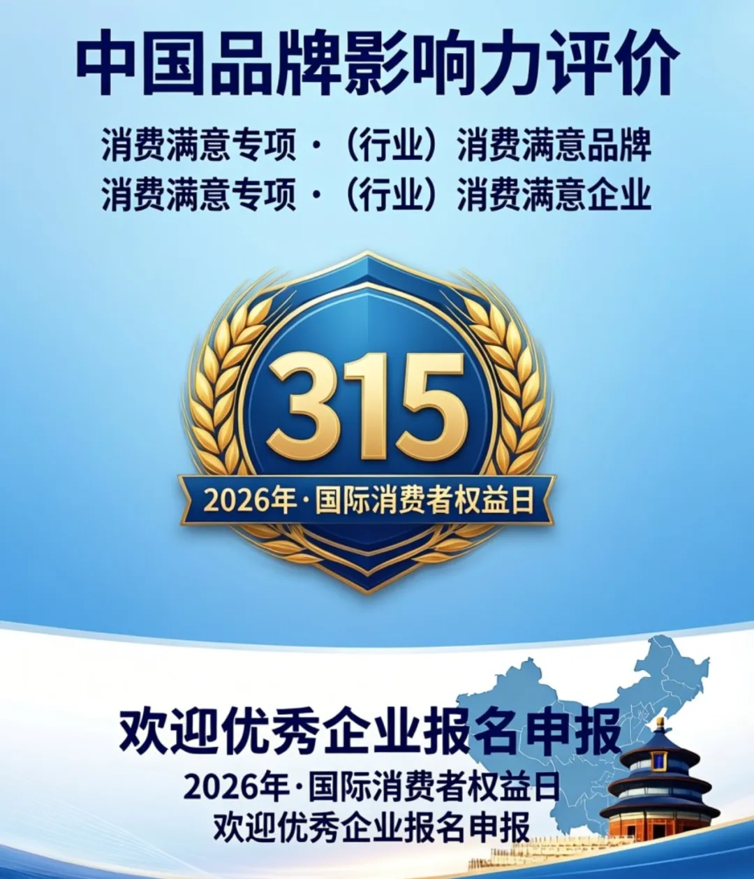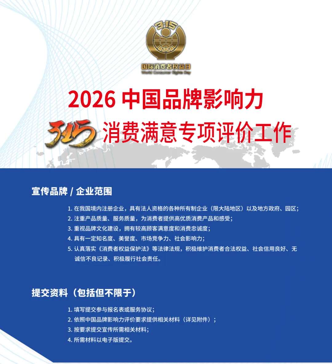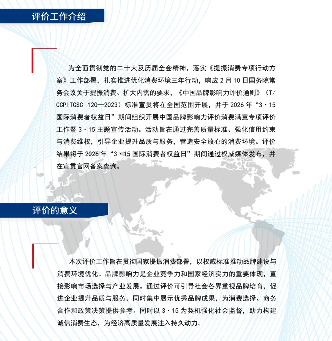 2026年“315国际消费者权益日”期间,重点开展中国品牌影响力评价“消费者满意”专项评价工作,欢迎优秀企业报名申报。