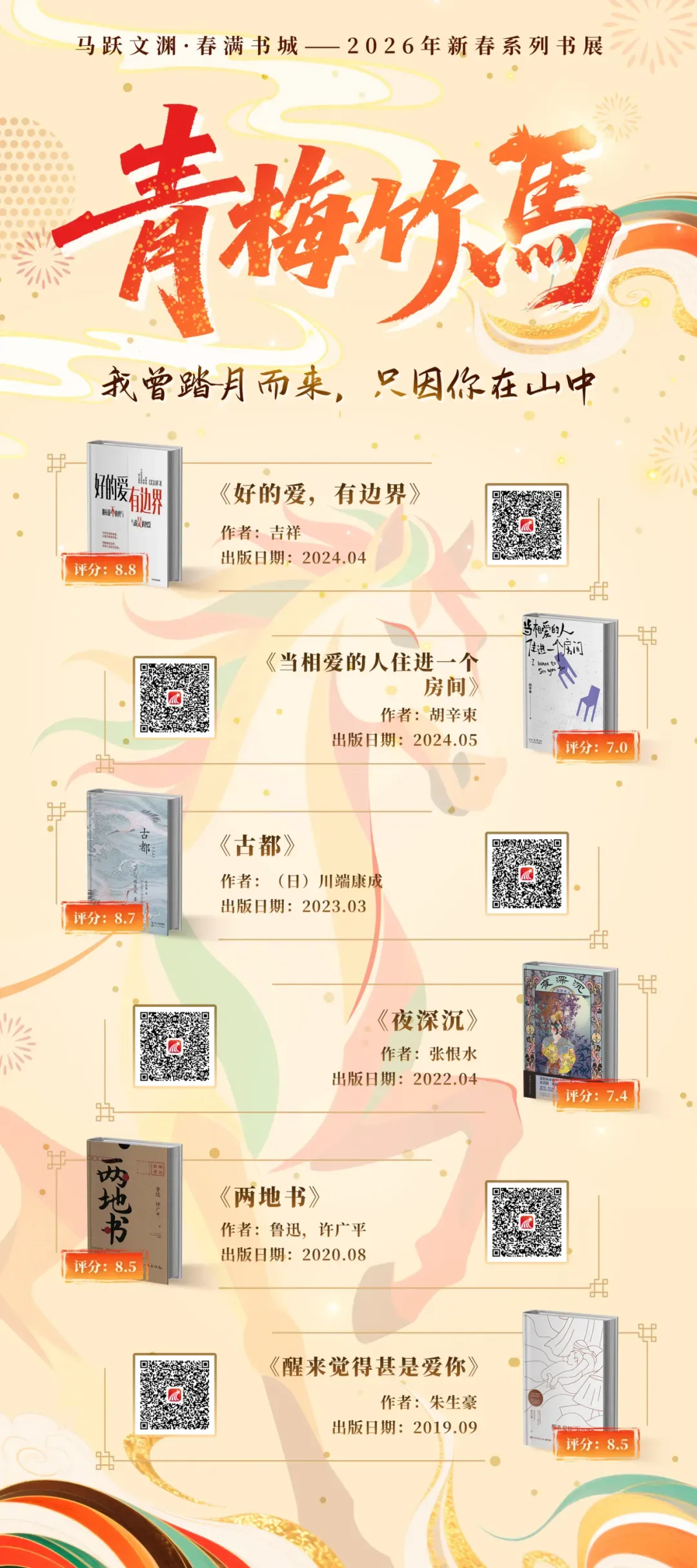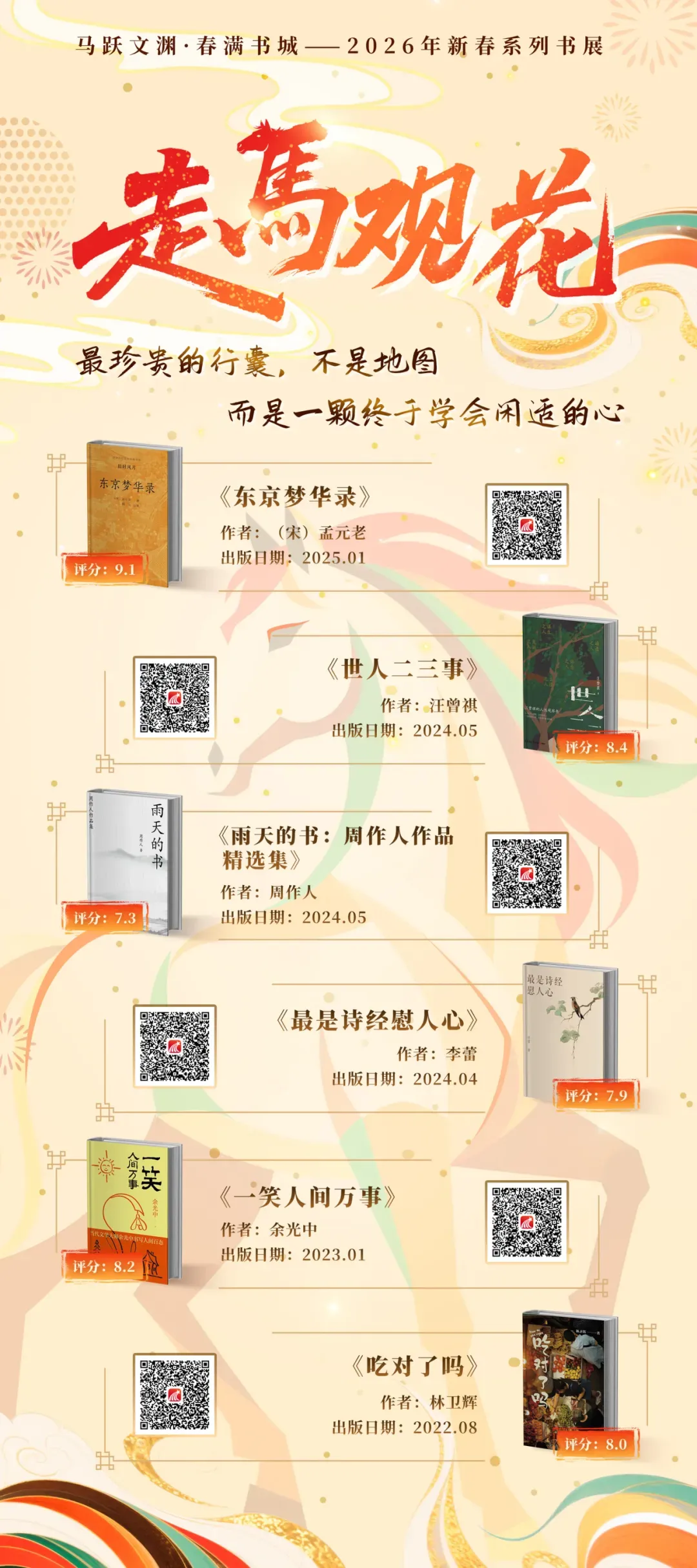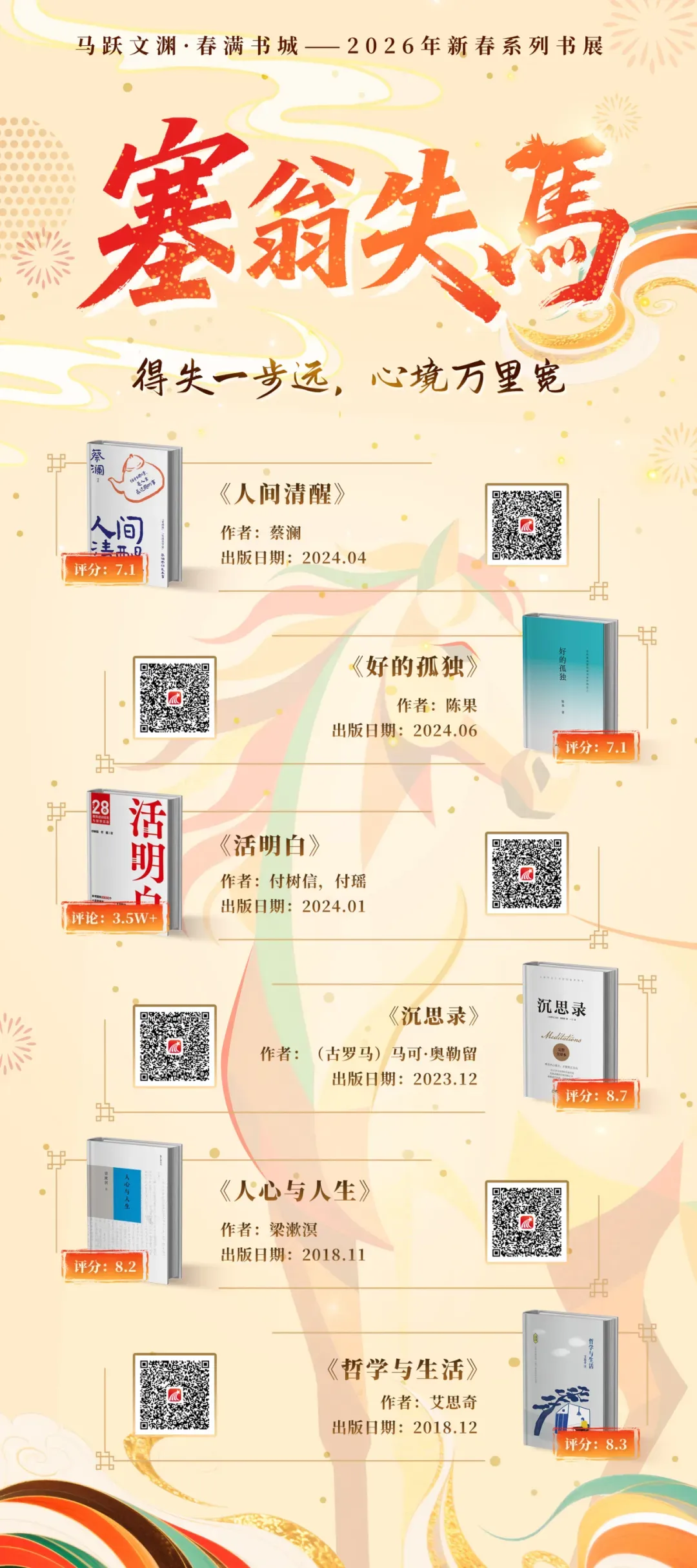 本书展以“马”为引,精选十三个含“马”成语,依其意境配以新书佳作:从梁漱溟、吕思勉、林语堂的沉静著述,到朱天心、陈果、杨天真等人的敏锐书写,涵盖小说、传记、历史、情感等诸多领域。每一组成语与书籍的相遇,都是古今精神的一次共振,它让沉淀千年的语汇焕发生机,引领我们共同感受中华文化绵延不绝的磅礴气韵。