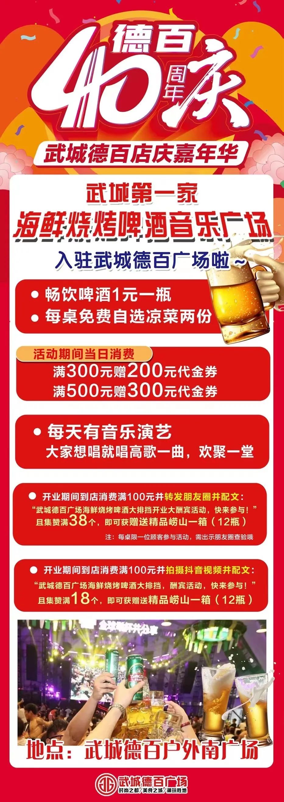 开业期间到店消费满100元并转发朋友圈并配文:“武城德百广场海鲜烧烤啤酒大排挡开业大酬宾活动,快来参与!”且集赞满38个,即可获赠送精品崂山一箱(12瓶)(每桌限一位顾客参与活动,需出示朋友圈查验哦~