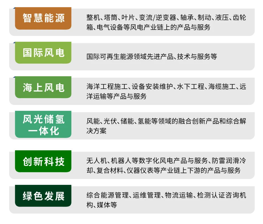 2022年,CWP设置了智慧能源、绿色发展、海上风电、风光储氢一体化、国际风电、创新科技六大展示板块,涵盖风电开发建设、设备制造、技术研发、检测认证、配套服务全产业链。