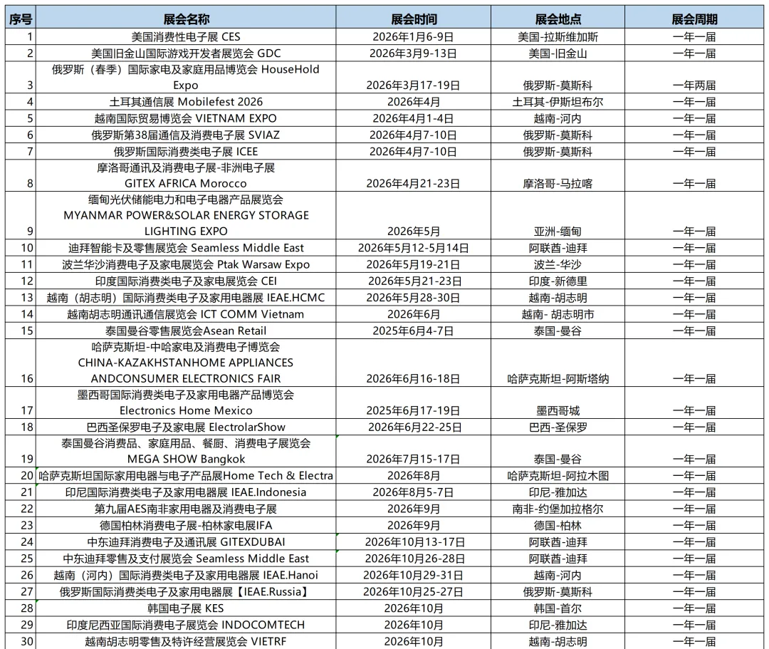 2026年全球电子消费品展会计划表