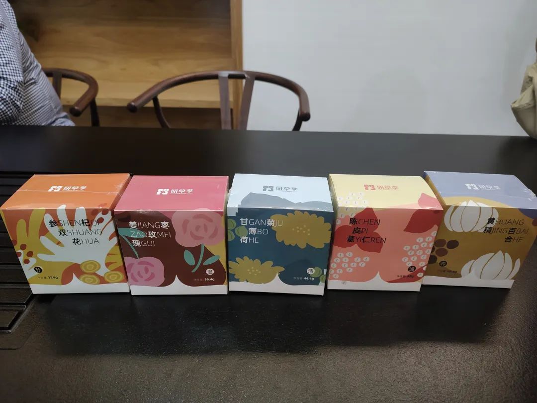 上面的五款产品,是他们根据黄元御的理论思想,用中药做出来的五款茶饮包,分补,温,清,通,养五个款式,目前茶包品牌也在做。