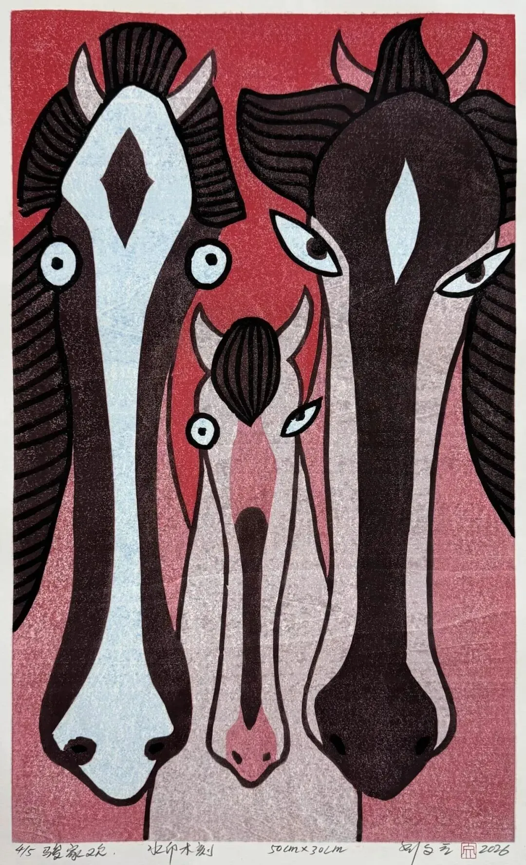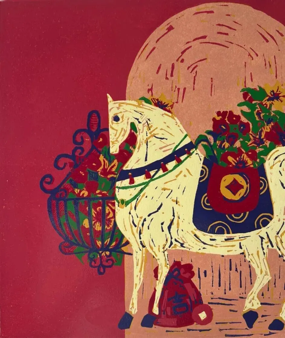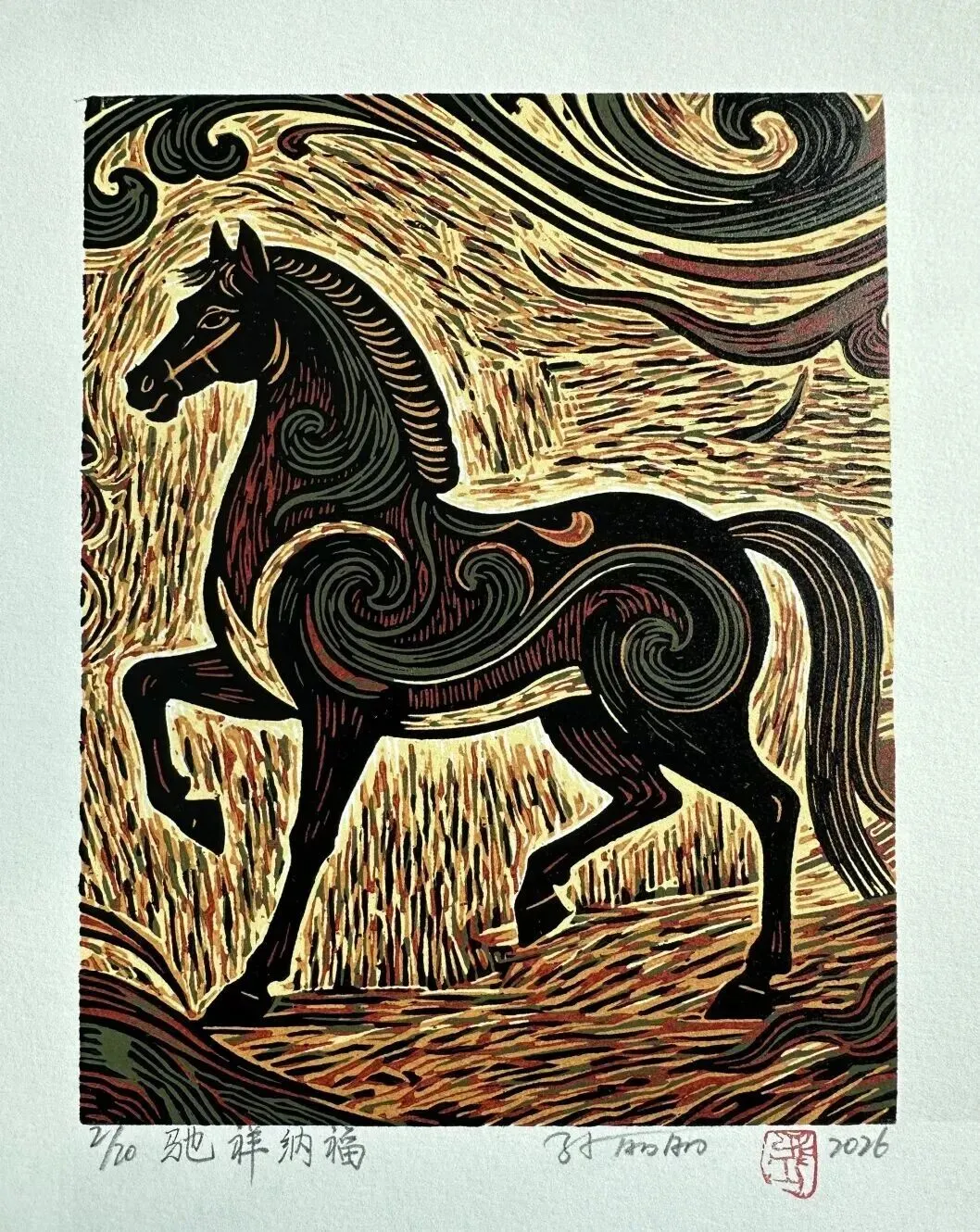 展览精选套色木刻、水印木刻、黑白木刻、丝网版等多个版种,每幅作品都凝聚着艺术家对黑土地的深情厚意。一刀一刻,刻出的是冰雪天地间骏马的矫健身姿;一色一墨,印出的是新春佳节的喜庆祥和。这些作品不仅展现了龙江版画的独特魅力,更传递着“一马当先”的奋斗精神和“马到成功”的美好祝愿。愿这些饱含匠心的版画作品,为您的新春增添一抹艺术的亮色,也为新的一年送上最美好的祝愿——龙马精神,万象更新!马到成功,好事连连!