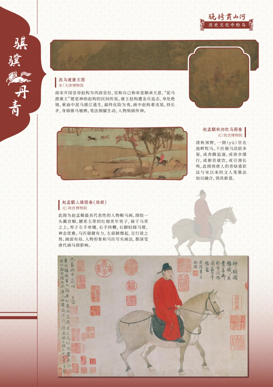 赵孟頻人骑图卷(局部),元,故宫博物院。此图为赵孟頻最具代表性的人物鞍马画。图绘一头戴官帽、腰系玉带的红袍青年男子,骑于马背之上。男子左手牵缰,右手持鞭,右脚轻踩马镫,神态优雅。马匹强健有力,左前蹄微起,呈行进之势。画面布局、人物形象和马匹写实画法,都深受唐代画马图影响。