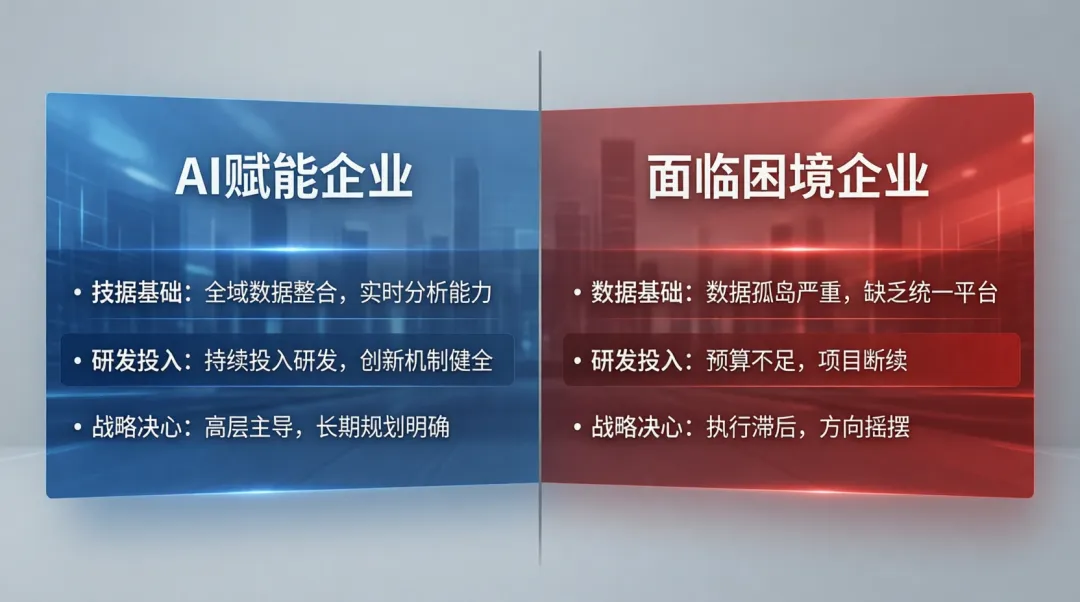 - 数据基础差异:AI模型的质量直接取决于训练数据的质量和数量。那些早期就建立了完善生产数据系统的企业,在AI转型时拥有天然优势。