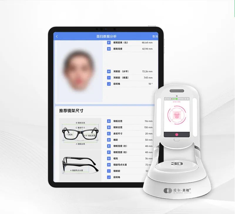 三维面部扫描技术,是利用三维智能面部扫描仪,采集眼镜佩戴者的头面部数据,通过三维面部建模以及AI参数化分析,给出契合佩戴者面部结构的10项镜框架参数建议报告。同时,它还可以根据扫描的佩戴者的脸型,为佩戴者做出镜框推荐,从而帮助让佩戴者挑选与自己头面部更契合且更能修饰自己面部轮廓的眼镜!