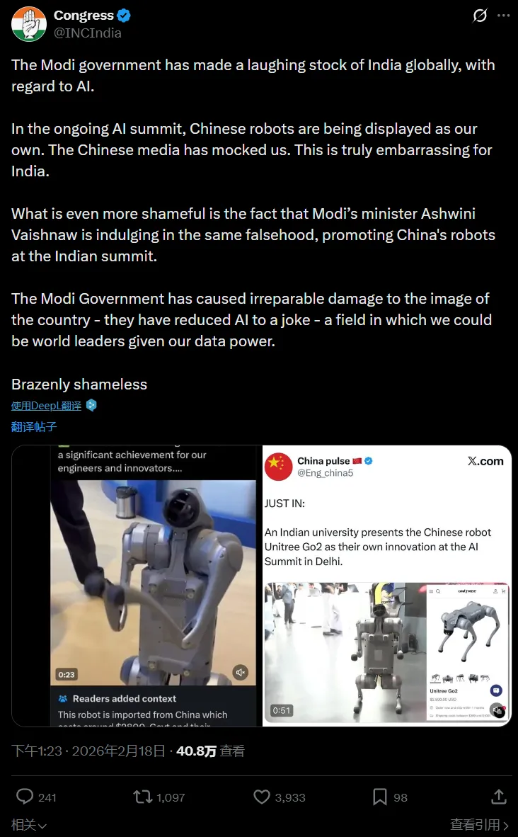 该消息扩散后,海外社交媒体上有大量网友将其作为嘲笑印度的最新笑话,印度政坛的反对派也开始“上纲上线”。印度国大党在社媒上发帖表示:“莫迪政府在人工智能领域让印度在全球沦为笑柄。