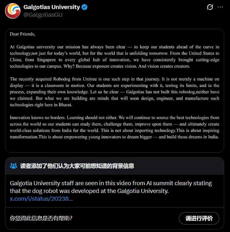 舆论发酵后,该大学在社交媒体“X”上发帖承认,他们在峰会上展出的机器狗的确就是宇树科技的Go2机器狗。该大学表示,采购该款机器狗主要是作为学生学习和实验的工具使用,希望他们可以“学习、挑战、改进来自全世界的最先进技术,并最终为世界创造一份来自印度的解决方案”。