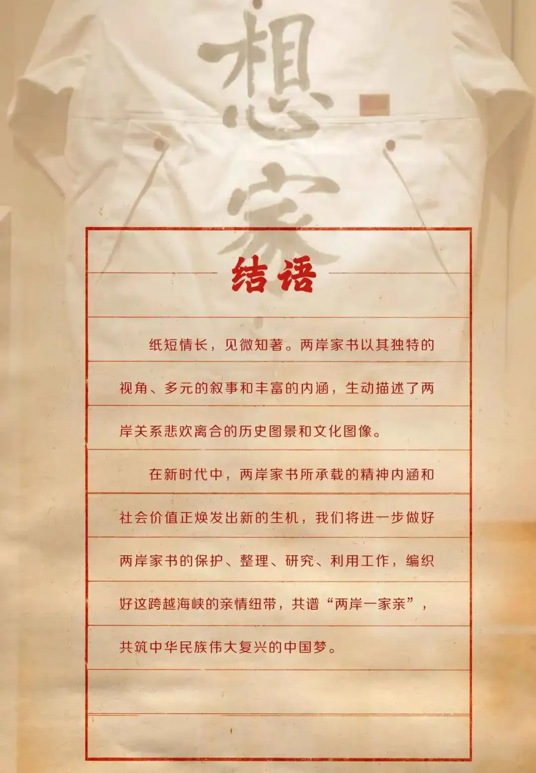 《雁字回时 两岸家书特展》第二期,今日启卷。纸短情长,见微知著,这些跨越海峡的亲情纽带,正焕发新的生机。春风送暖,且让我们共续这一纸深情,在两岸家书的故事里,携手同心,同赴团圆。