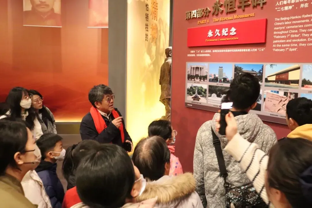 活动当天,郑州街巷洋溢着团圆的热闹气息,郑州二七纪念馆内人头攒动。秉持着对红色历史的崇敬之心,游客们早早抵达展区等候,随着馆长的登场,一场沉浸式的红色溯源之旅正式开启。作为 “二七精神” 的守护人,郑州二七纪念馆馆长张江山以深厚的专业积淀和生动的叙事方式,为大家解锁了馆藏文物背后的热血密码 —— 罢工器具上的斑驳痕迹、烈士手稿中的赤诚字迹,都在馆长的讲述中变得鲜活可感;“二七惨案” 的悲壮历程、革命先辈的家国初心,通过权威解读直抵人心,让每一件文物都成为了传承红色基因的鲜活教材,让 “千秋二七” 展览的精神内涵得到了深刻诠释。
