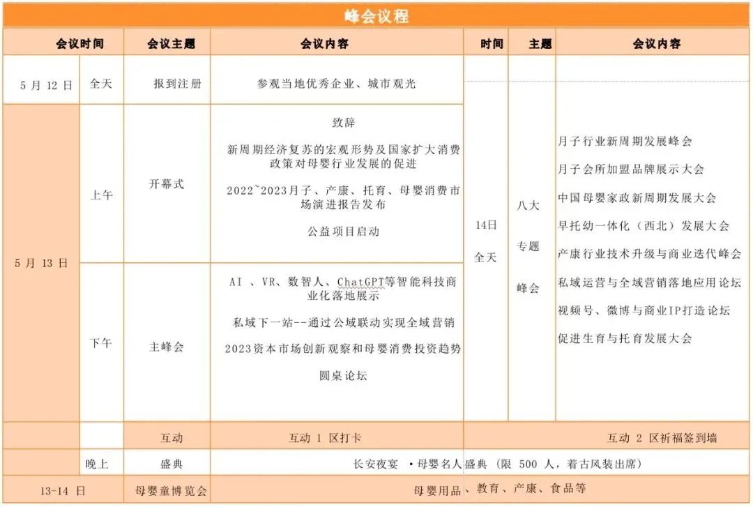 本届峰会预计规模3000+,主会场有领导、专家讲趋势;专题研讨、高端对话、新项目启动签约仪式;网络直播、操盘手演讲等。同时设立月子行业新周期发展峰会、月子会所加盟品牌展示大会、托育分会、早托幼一体化(西北)大会、产后康复、中国母婴家政大会、私域运营与全域营销、视频号微博与数字人商业IP打造等主题分会场。