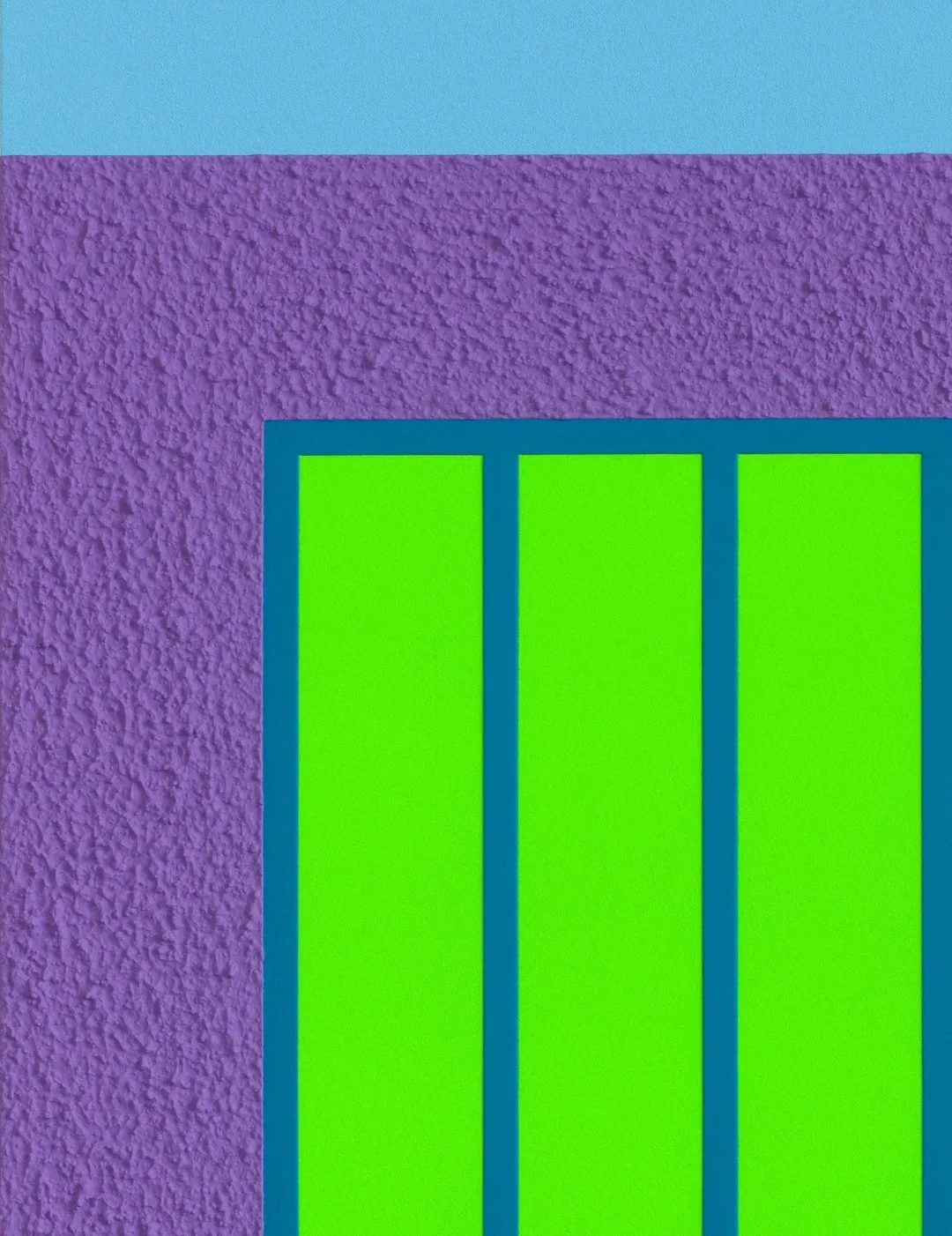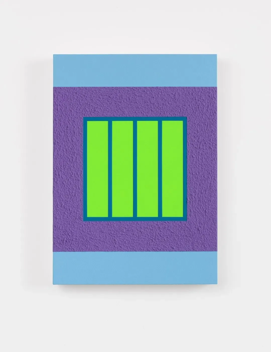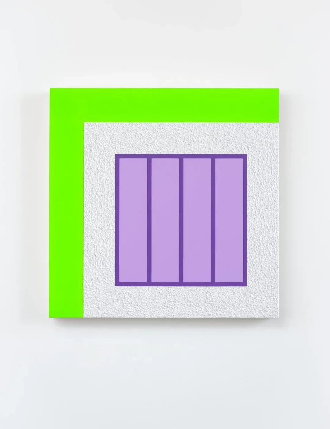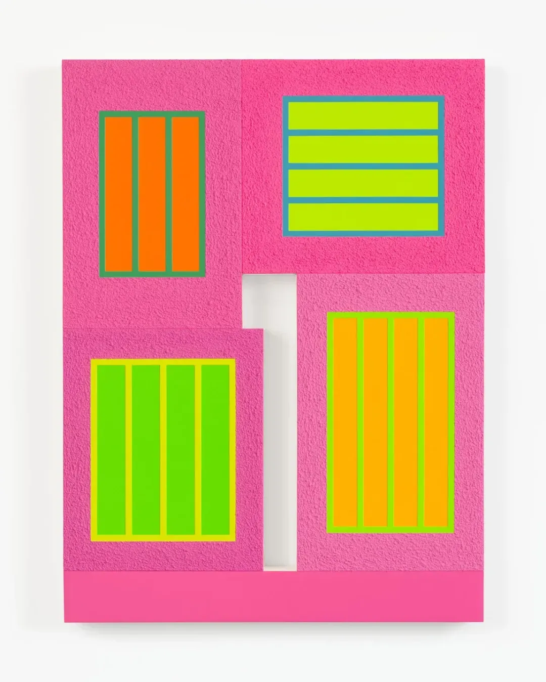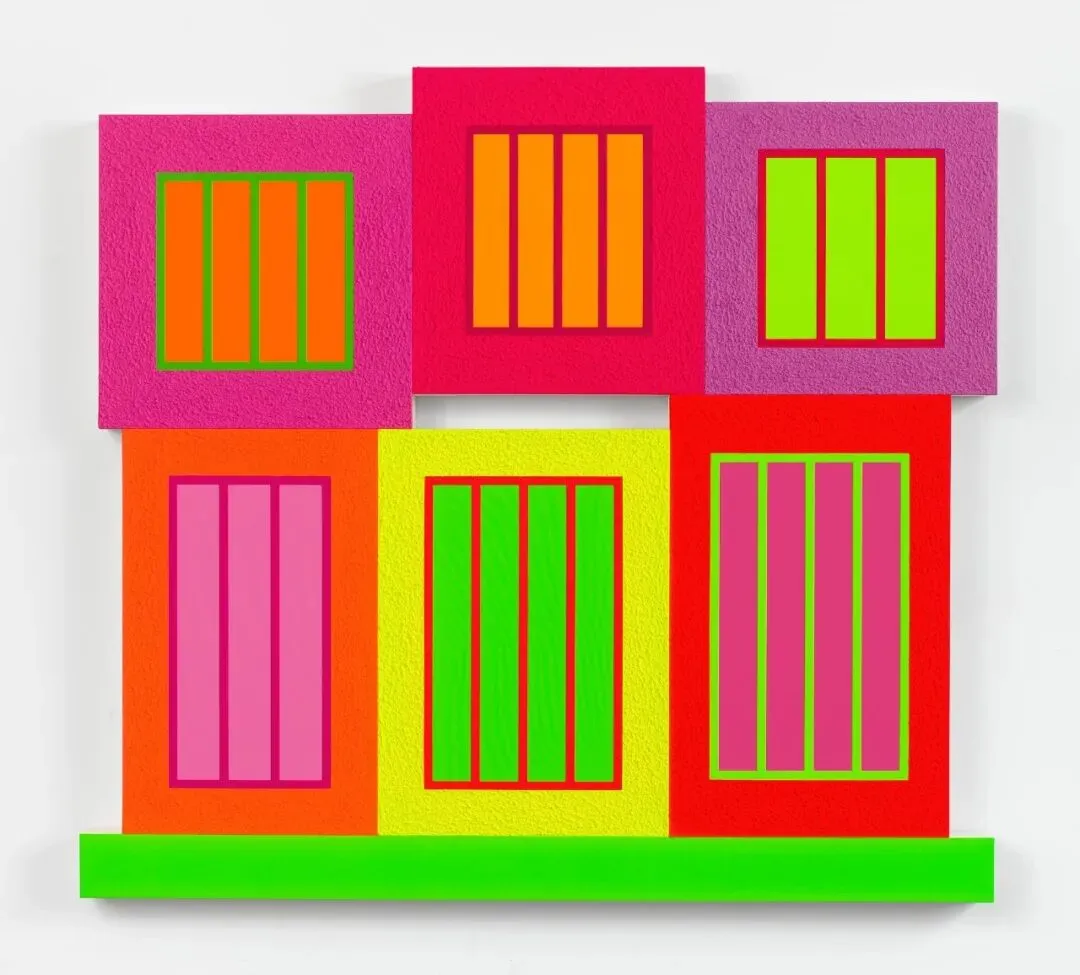 画布上饱和的亮色在平滑与高度肌理化表面之间摆荡,部分采用Roll-a-Tex涂料——这种模拟廉价建筑涂料的方式刻意暴露其人工痕迹,以掩饰瑕疵、遮蔽缺陷并美化表面。正是这种持续不断的对立游戏,使哈雷的作品始终充满张力。当他围绕压抑与禁锢建构视觉词汇,并将方形直接指涉为监狱时,却又刻意赋予其荧光色彩。