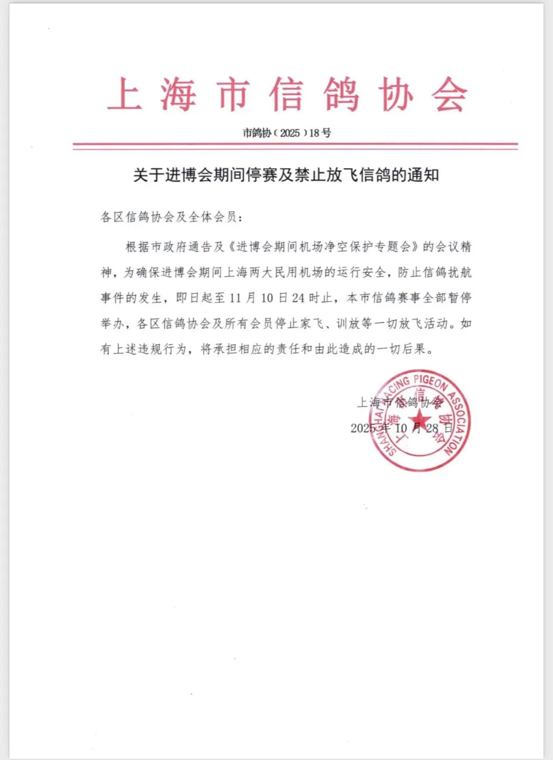 关于进博会期间停赛及禁止家飞信鸽的通知