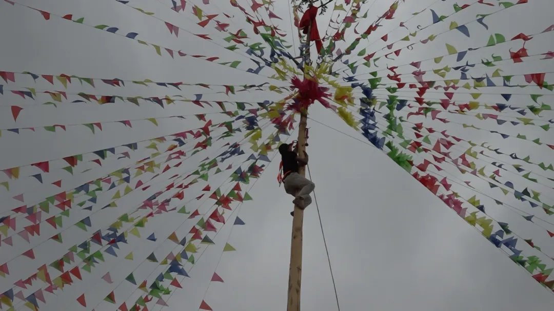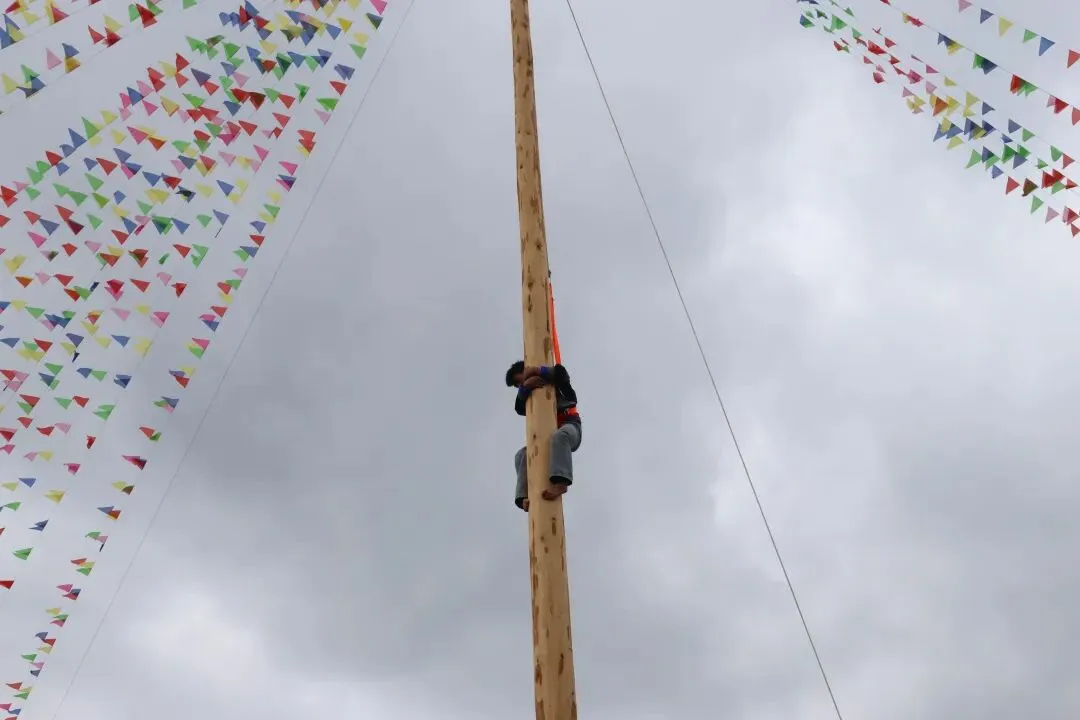 动感与惊险并存,欢乐与激情碰撞。爬花杆作为花山节最具标志性、最激动人心的传统项目,始终占据着现场的“C位”。一根数十米高、打磨光滑的花杆矗立在广场中央,参赛选手身着轻便服饰,不借助任何工具,仅凭腰腹力量与四肢协作,手脚交替间稳步攀升,身姿矫健如猿,引得现场观众阵阵惊呼、掌声雷动。