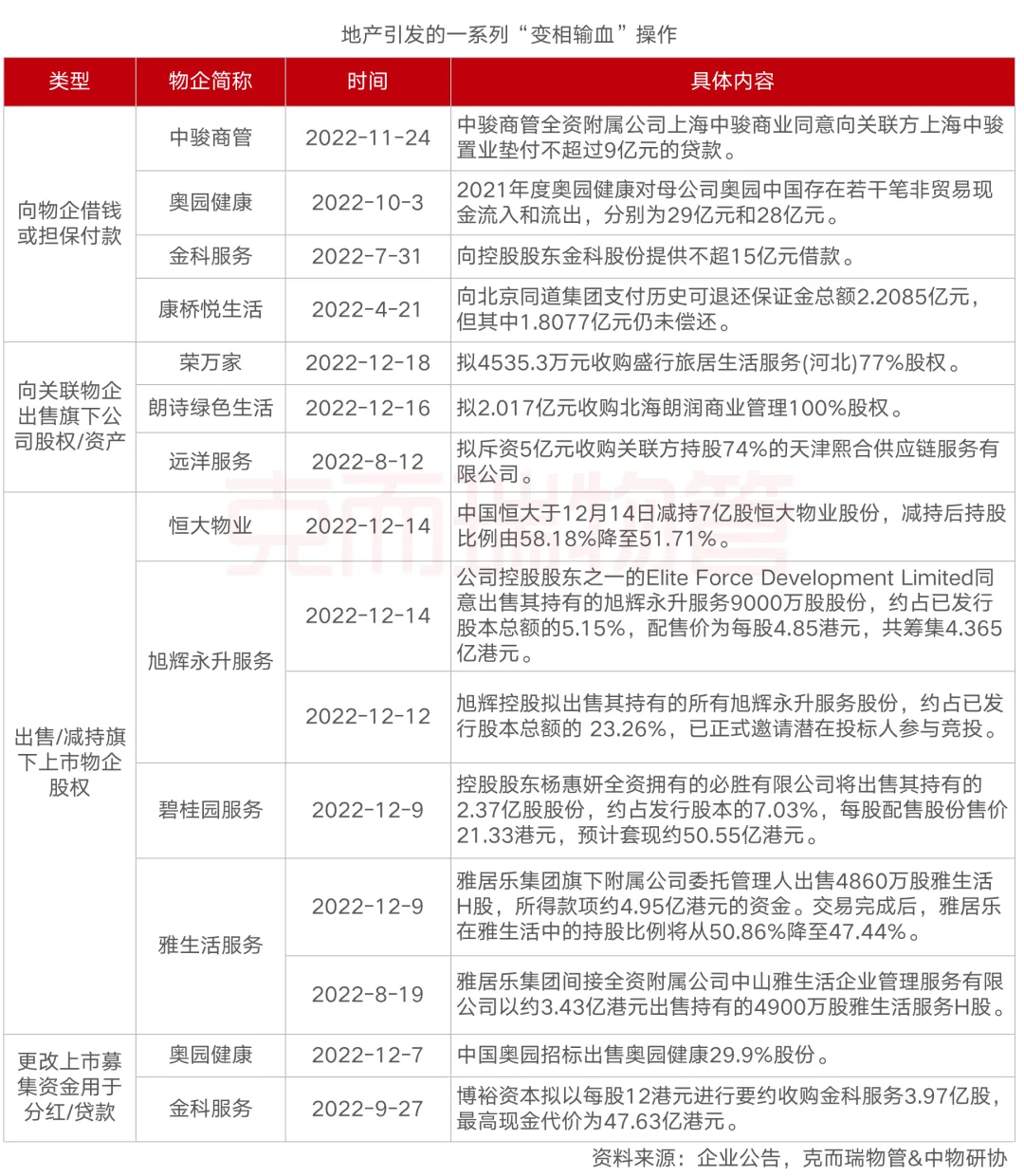 再如,恒大物业违规为母公司恒大集团提供担保,134亿元存款质押被相关银行强制执行。后面的调查结果,披露了一个惊人内幕:恒大物业和中国恒大共用处所保管公司印章,以及使用相互连通并有时重叠的用印审批系统。还有,2022年7月,金科服务向金科股份借款15亿元,用于补充母公司流动资金。当时摩根大通就表示,担心金科服务未来会出现更多类似交易,以及母公司能否如期归还款项。果不其然,截止今年3月30日,首笔本金利息未能在宽限期内支付。所以今年业绩会上,很多物企都特别强调了与兄弟公司间的独立关系。比如碧桂园服务就表示,公司不依赖非业主增值服务(物企为母公司提供服务得到的收入),也很少依赖关联兄弟公司。而且经过多年第三方拓展,公司已经完全具备市场化独立能力。万物云也表示,十多年前,市场诟病公司虽然住宅做得好,但是项目都是万科的。现如今,公司67%的合同,已经跟万科地产没有任何关系了。由于物管行业市场集中度仍然偏低,所以多数物企首先考虑的,是通过收并购把规模做上来,提高市场占有率。据明源君统计,从2019年到2022年四年时间,物企收并购超过200宗,涉及金额超630亿元。其中,2021年物企收并购达到高潮,交易总额高达356亿元。趁着资本热度尚存,物企加快规模扩张无可厚非。可越是这个时候,企业就越容易迷失,浑然不顾高溢价和业务契合度,一心一意搞扩张。凡事皆有两面性,并购可以快速提升公司规模,可一旦收购对象业绩达不到预期,就将造成商誉减值,直接影响公司净利润。戳这里,管好利润现金流比如某龙头物企2022年整体毛利率下降5.9个百分点,原因就包括收并购带来的商誉减值及无形资产减值金额约17.7亿元,收并购带来的合同及客户关系等的摊销为10.8亿元。收得好的判断标准,不是收的时候怎么样,而是收进来之后,能不能把企业管理好。前几年,物管行业基本处在快速扩张抢地盘的非理性阶段,不少物企的想法往往是收了再说,继而导致部分外拓的市场化项目质量不高,拉低费率。比如新城悦服务就指出,并购子公司的毛利率相对不高,拉低了基础物业服务的整体毛利率。2022年并购子公司数量达到了11家,收入占比已经达到了27%,但并购子公司的毛利率还不到20%。而某头部物企,自2019年大规模收并购以来,亏损项目大幅提升,2022年3月亏损项目占比竟高达37.21%。所以,大举收并购带来的负面影响,的确值得物管企业好好反思。比如碧桂园服务就表示,2022年公司主动退出亏损或收缴率低的项目,总退出合约管理面积约8400万平方米,相当于一些小型物管上市公司的规模。招商积余则表示,物管行业正从重视规模扩张转向重视投后管理,公司也会聚焦一些估值合理、运作规范,同时在细分业态上有较强能力的标的公司。戳这里,了解云资管绿城服务也指出,今年将暂停新城市的市场拓展,重点提升北京、上海、深圳等九大核心城市的市占率。同时,公司还将停止与第三方中小开发商合作,战略性放弃部分收费单价较低、甲方资金不健康的项目以及年营收200万以下、非战略客户的项目。就像房企逢场必谈高质量发展一样,如果哪家物企还没有布局社区增值服务,那他一定会被同行嗤之以鼻。在物企的发展蓝图中,社区增值服务的覆盖范围非常广泛,比如社区团购、家具购买、家政服务、房地产交易、健康养老、文化教育、社区金融等等。有房企高层表示,如果物业服务是万亿级蓝海,那么增值服务就是10万亿级蓝海。
