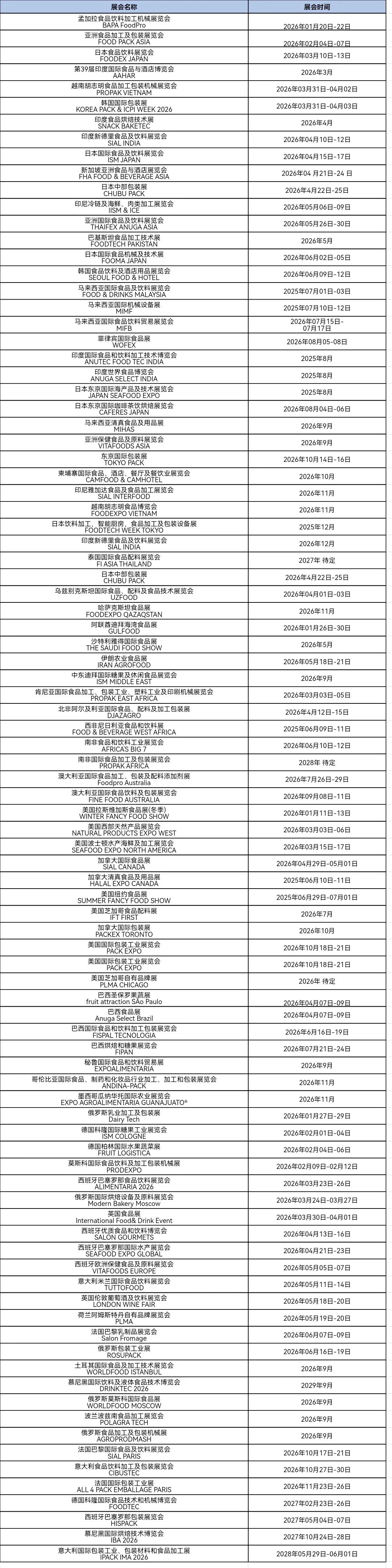 2026年全球食品展会计划表