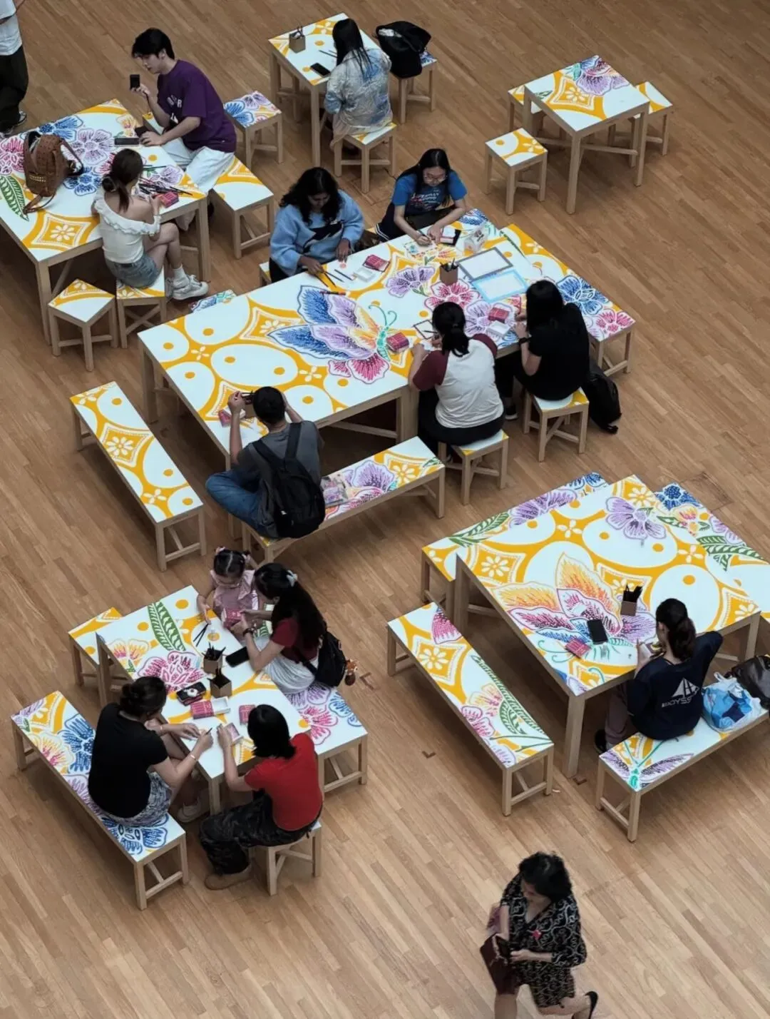 一旁,林明弘(Michael Lin)的绘画挪用了传统印花,醒目的尺幅为公众提供了一个休憩和思考的场域。这位因介入式公共装置而在全球享有盛誉的艺术家,最新委任项目刚于台中市立美术馆和新加坡国家美术馆亮相。