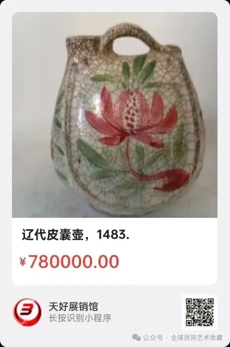 辽代皮囊壶,高:13.5公分,宽:12公分,厚:10.公分。阐述:皮囊壶是契丹民族,草原特有的一种器物,似皮囊縫制的水囊或酒囊而命名,具有鲜明的民族风格。扁壶,随形起线陇起,似马蹬,又名马蹬壶。灰胎施化妆土,红绿彩鲜花盛开,反映了契丹民族草原风格。来源1483.V.