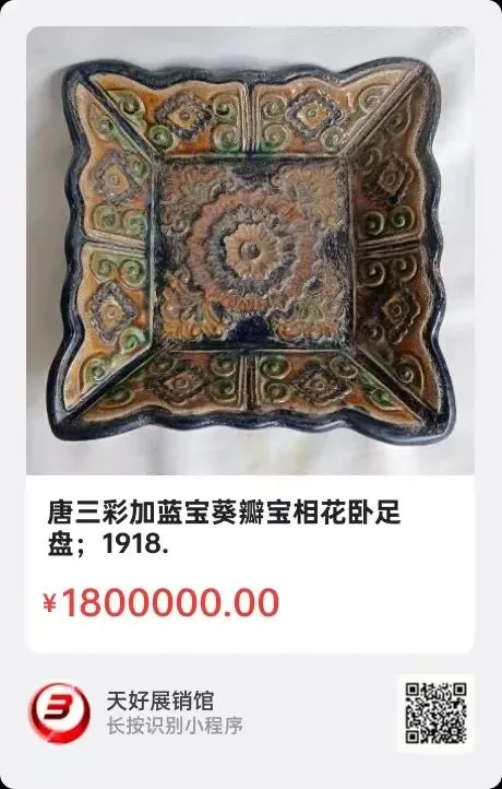 唐三彩加蓝宝葵瓣宝相花卧足盘;20.5公分见方,高4.5公分,底部方边17.3公分,重量849克,偶见少量蓝釉(钴料)或黑釉,但极为罕见,红色在唐三彩中极少使用。需注意“三彩”并非仅指三种颜色,而是多彩之意,釉色多样性与稀有性。来源1918.V.