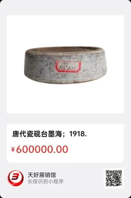唐代瓷砚台墨海;重量471.5克口径13.8高度3.6厘米,唐代瓷砚台以辟雍砚和箕形砚(又称风字砚)为主流形制。辟雍砚因仿周代环水学堂“辟雍”得名,砚面中央凸起,周围环水槽,圈足设计,如故宫藏唐代青釉辟雍砚高3.9cm,釉色青绿,胎质厚重。本唐代瓷砚注重实用与美学的结合,青釉技术成熟,通体施青绿釉,釉薄均匀;砚台周圈饰以山峰纹样,胎质、釉色、形制符合唐代特征,辟雍砚的环水槽设计为关键标识。唐代瓷砚台墨海收藏精品兼具学术与市场潜力。目前公开拍卖记录中,唐代瓷砚台(如青瓷砚台)的成交价可达百万元级别。唐代瓷砚台墨海存世稀少且工艺精湛,价格可能接近此类拍品。来源1918。V.