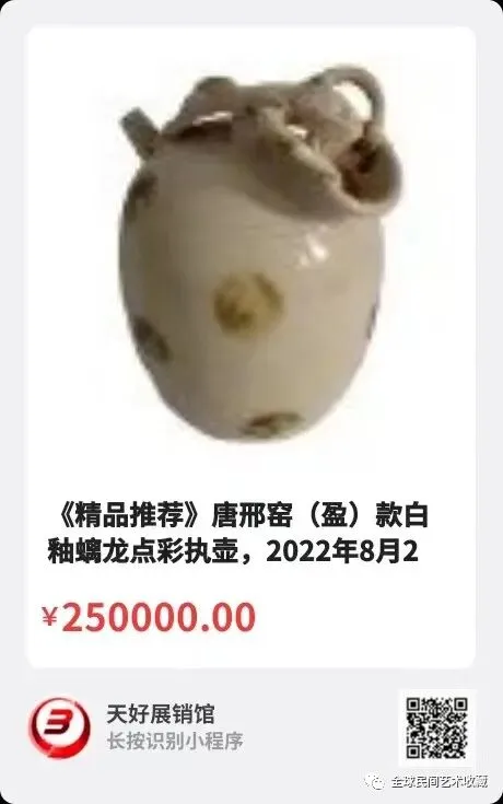 唐邢窑(盈)款白釉螭龙点彩执壶,高22Cm,口直径5CmX15,5Cm,腰直径14Cm,足直径7,5Cm,己经曹晓宁专家鉴定,2022年8月27曰,经天好评审团评审,以6票优势荣登精品榜,获第五十四期天好海选精品。来源0980.V.