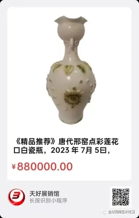 唐代邢窑点彩莲花口白瓷瓶,这是一件邢窑白瓷中的精品,器型规整,制作精致,其胎质坚实细腻,釉色纯白光亮滋润,质美如玉。植物釉彩素美,风格淡雅。瓶上端有凤凰穿中飞翔,瓶肚四方各有莲花绽放,瓶底有手工“盈”字款样。其精湛的工艺和优良的品质令人叹为观止!尺寸:高27cm,肚径14cm,底径7.5cm,口径7.6cm。2023 年 7月 5曰,经天好评审团评审,以 7票优势荣登精品榜,获第八十八期天好海选精品。来源1506.V.