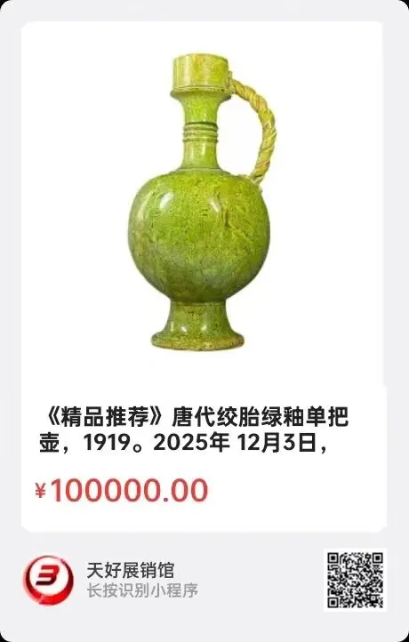 唐代绿釉执壶。Ai鉴评:这件绿釉执壶高17.5厘米,宽12厘米。从形制、釉色与胎质来看,具唐代巩县窑绿釉瓷典型特征。器型为撇口、束颈、溜肩、鼓腹,曲柄与短流搭配协调,整体线条饱满圆润,是唐代执壶经典造型。釉面呈鲜亮的瓜皮绿,开片细密自然,釉层莹润且有玻璃质感,为巩县窑绿釉的上乘施釉工艺。底部露胎处胎质灰白、质地疏松,符合唐代巩县窑胎土特征,修足手法粗犷古朴。器物尺寸适中,整体保存完好无明显冲线、磕损,是唐代单色釉瓷中颇具代表性的实用器,兼具工艺价值与时代审美特征,为唐代绿釉瓷中的精品。2025年 12月24日,经天好评审团评审,以6票优势荣登精品榜,获第195期天好海选精品。来源1919。